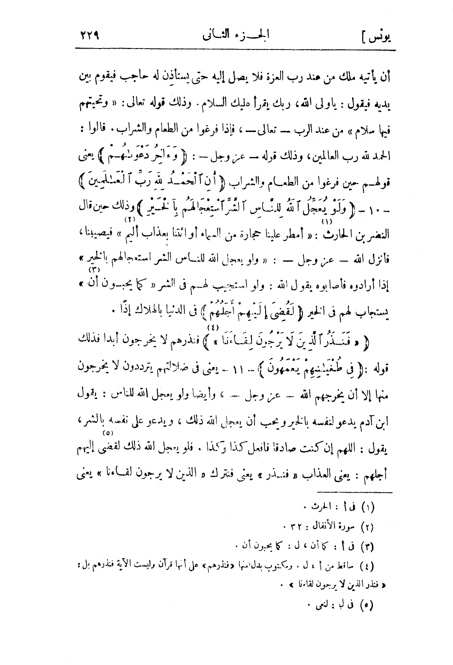 الحمد لله رب العالمين، وذلك قوله- عز وجل-: وَآخِرُ دَعْواهُمْ يعني قولهم حين فرغوا من الطعام والشراب أَنِ الْحَمْدُ لِلَّهِ رَبِّ الْعالَمِينَ- 10- وَلَوْ يُعَجِّلُ اللَّهُ لِلنَّاسِ الشَّرَّ اسْتِعْجالَهُمْ بِالْخَيْرِ وذلك حين قال النضر بن الحارث: «1» فَأَمْطِرْ عَلَيْنا حِجارَةً مِنَ السَّماءِ أَوِ ائْتِنا بِعَذابٍ أَلِيمٍ «2» فيصيبنا، فأنزل الله- عز وجل-: وَلَوْ يُعَجِّلُ اللَّهُ لِلنَّاسِ الشَّرَّ اسْتِعْجالَهُمْ بِالْخَيْرِ إذا أرادوه فأصابوه يقول الله: ولو استجيب لهم في الشر «كما يحبون أن «3» » يستجاب لهم فى الخير لَقُضِيَ إِلَيْهِمْ أَجَلُهُمْ في الدنيا بالهلاك إذا.