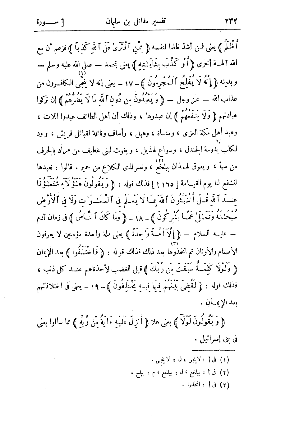 يعني فمن أشد ظلما لنفسه مِمَّنِ افْتَرى عَلَى اللَّهِ كَذِباً فزعم أن مع الله آلهة أخرى أَوْ كَذَّبَ بِآياتِهِ يعني بمحمد- صلى الله عليه وسلم- وبدينه إِنَّهُ لا يُفْلِحُ الْمُجْرِمُونَ- 17- يعنى إنه لا ينجّى «1» الكافرون من عذاب الله- عز وجل- وَيَعْبُدُونَ مِنْ دُونِ اللَّهِ ما لا يَضُرُّهُمْ إن تركوا عبادتهم وَلا يَنْفَعُهُمْ إن عبدوها، وذلك أن أهل الطائف عبدوا اللات، وعبد أهل مكة العزى، ومناة، وهبل، وأساف ونائلة لقبائل قريش، وود لكلب بدومة الجندل، وسواع لهذيل، ويغوث لبني غطيف من مراد بالجرف من سبأ، ويعوق لهمذان ببلخع «2» ، ونسر لذي الكلاع من حمير. قالوا: نعبدها لتشفع لنا يوم القيامة [165 ا] فذلك قوله: وَيَقُولُونَ هؤُلاءِ شُفَعاؤُنا عِنْدَ اللَّهِ قُلْ أَتُنَبِّئُونَ اللَّهَ بِما لا يَعْلَمُ فِي السَّماواتِ وَلا فِي الْأَرْضِ سُبْحانَهُ وَتَعالى عَمَّا يُشْرِكُونَ- 18- وَما كانَ النَّاسُ في زمان آدم- عليه السلام- إِلَّا أُمَّةً واحِدَةً يعني ملة واحدة مؤمنين لا يعرفون الأصنام والأوثان ثم اتخذوها «3» بعد ذلك فذلك قوله: فَاخْتَلَفُوا بعد الإيمان وَلَوْلا كَلِمَةٌ سَبَقَتْ مِنْ رَبِّكَ قبل الغضب لأخذناهم عند كل ذنب، فذلك قوله: لَقُضِيَ بَيْنَهُمْ فِيما فِيهِ يَخْتَلِفُونَ- 19- يعنى فى اختلافاتهم بعد الإيمان.