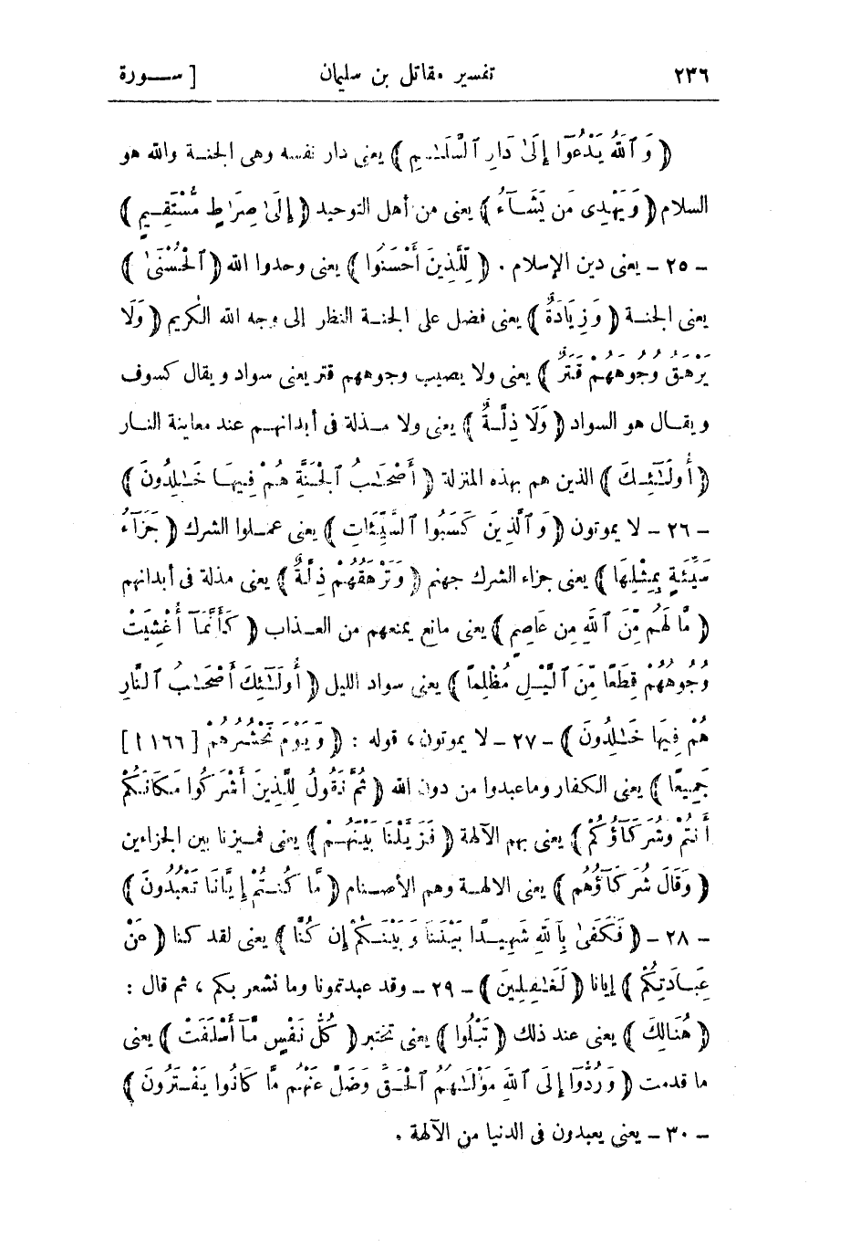 وَاللَّهُ يَدْعُوا إِلى دارِ السَّلامِ يعني دار نفسه وهي الجنة والله هو السلام وَيَهْدِي مَنْ يَشاءُ يعني من أهل التوحيد إِلى صِراطٍ مُسْتَقِيمٍ- 25- يعنى دين الإسلام. لِلَّذِينَ أَحْسَنُوا يعني وحدوا الله الْحُسْنى يعني الجنة وَزِيادَةٌ يعني فضل على الجنة النظر إلى وجه الله الكريم وَلا يَرْهَقُ وُجُوهَهُمْ قَتَرٌ يعني ولا يصيب وجوههم قتر يعني سواد ويقال كسوف ويقال هو السواد وَلا ذِلَّةٌ يعني ولا مذلة في أبدانهم عند معاينة النار أُولئِكَ الذين هم بهذه المنزلة أَصْحابُ الْجَنَّةِ هُمْ فِيها خالِدُونَ- 26- لا يموتون وَالَّذِينَ كَسَبُوا السَّيِّئاتِ يعنى عملوا الشرك جَزاءُ سَيِّئَةٍ بِمِثْلِها يعني جزاء الشرك جهنم وَتَرْهَقُهُمْ ذِلَّةٌ يعني مذلة في أبدانهم مَا لَهُمْ مِنَ اللَّهِ مِنْ عاصِمٍ يعني مانع يمنعهم من العذاب كَأَنَّما أُغْشِيَتْ وُجُوهُهُمْ قِطَعاً مِنَ اللَّيْلِ مُظْلِماً يعني سواد الليل أُولئِكَ أَصْحابُ النَّارِ هُمْ فِيها خالِدُونَ- 27- لا يموتون، قوله: وَيَوْمَ نَحْشُرُهُمْ جَمِيعاً [166 ا] يعني الكفار وما عبدوا من دون الله ثُمَّ نَقُولُ لِلَّذِينَ أَشْرَكُوا مَكانَكُمْ أَنْتُمْ وَشُرَكاؤُكُمْ يعنى الآلهة فَزَيَّلْنا بَيْنَهُمْ يعني فميزنا بين الجزاءين وَقالَ شُرَكاؤُهُمْ يعني الآلهة وهم الأصنام مَا كُنْتُمْ إِيَّانا تَعْبُدُونَ- 28- فَكَفى بِاللَّهِ شَهِيداً بَيْنَنا وَبَيْنَكُمْ إِنْ كُنَّا يعني لقد كنا عَنْ عِبادَتِكُمْ إيانا لَغافِلِينَ- 29- وقد عبدتمونا وما نشعر بكم، ثم قال: