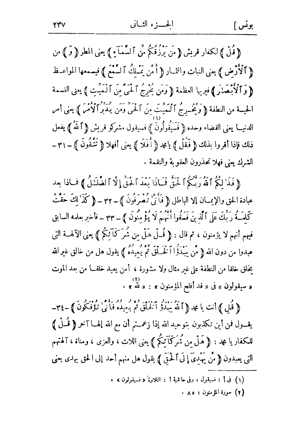 فَذلِكُمُ اللَّهُ رَبُّكُمُ الْحَقُّ فَماذا بَعْدَ الْحَقِّ إِلَّا الضَّلالُ فماذا بعد عبادة الحق والإيمان إلا الباطل فَأَنَّى تُصْرَفُونَ- 32- كَذلِكَ حَقَّتْ كَلِمَةُ رَبِّكَ عَلَى الَّذِينَ فَسَقُوا أَنَّهُمْ لا يُؤْمِنُونَ- 33- فأخبر بعلمه السابق فيهم أنهم لا يؤمنون، ثم قال: قُلْ هَلْ مِنْ شُرَكائِكُمْ يعني الآلهة التي عبدوا من دون الله مَنْ يَبْدَؤُا الْخَلْقَ ثُمَّ يُعِيدُهُ يقول هل من خالق غير الله يخلق خلقا من النطفة على غير مثال ولا مشورة، أمن يعيد خلقا من بعد الموت سَيَقُولُونَ فى قَدْ أَفْلَحَ الْمُؤْمِنُونَ: لِلَّهِ «2» .
