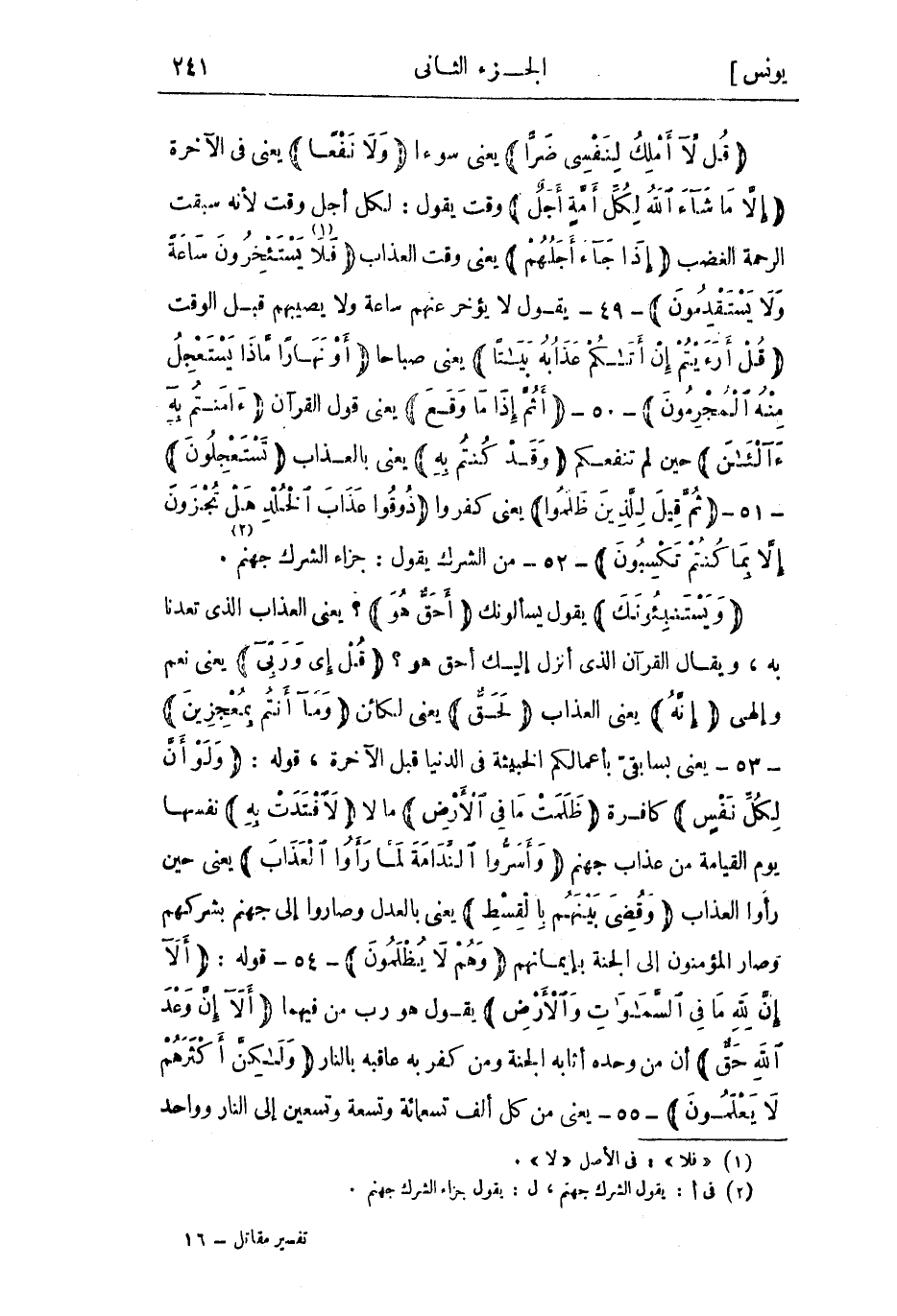 قُلْ لا أَمْلِكُ لِنَفْسِي ضَرًّا يعني سوءا وَلا نَفْعاً يعني في الآخرة إِلَّا مَا شاءَ اللَّهُ لِكُلِّ أُمَّةٍ أَجَلٌ وقت يقول: لكل أجل وقت لأنه سبقت الرحمة الغضب إِذا جاءَ أَجَلُهُمْ يعني وقت العذاب فَلا «1» يَسْتَأْخِرُونَ ساعَةً وَلا يَسْتَقْدِمُونَ- 49- يقول لا يؤخر عنهم ساعة ولا يصيبهم قبل الوقت قُلْ أَرَأَيْتُمْ إِنْ أَتاكُمْ عَذابُهُ بَياتاً يعني صباحا أَوْ نَهاراً مَاذَا يَسْتَعْجِلُ مِنْهُ الْمُجْرِمُونَ- 50- أَثُمَّ إِذا ما وَقَعَ يعنى قول القرآن آمَنْتُمْ بِهِ آلْآنَ حين لم تنفعكم وَقَدْ كُنْتُمْ بِهِ يعني بالعذاب تَسْتَعْجِلُونَ- 51- ثُمَّ قِيلَ لِلَّذِينَ ظَلَمُوا يعني كفروا ذُوقُوا عَذابَ الْخُلْدِ هَلْ تُجْزَوْنَ إِلَّا بِما كُنْتُمْ تَكْسِبُونَ- 52- من الشرك يقول: جزاء الشرك جهنم «2» .
