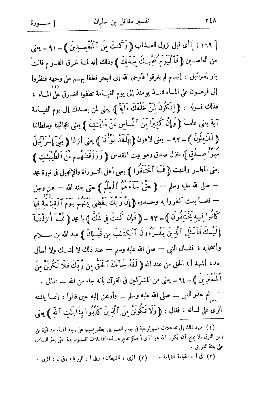 [169 ا] أي قبل نزول العذاب وَكُنْتَ مِنَ الْمُفْسِدِينَ- 91- يعنى من العاصين فَالْيَوْمَ نُنَجِّيكَ بِبَدَنِكَ وذلك أنه لما غرق القوم قالت بنو إسرائيل: إنهم لم يغرقوا فأوحى الله إلى البحر فطفا بهم على وجهه فنظروا إلى فرعون على الماء فمنذ يومئذ إلى يوم القيامة تطفوا الغرقى على «1» الماء، فذلك قوله: لِتَكُونَ لِمَنْ خَلْفَكَ آيَةً يعني لمن بعدك إلى يوم القيامة آية يعني علما وَإِنَّ كَثِيراً مِنَ النَّاسِ عَنْ آياتِنا يعني عجائبنا وسلطاننا لَغافِلُونَ- 92- يعني لاهون وَلَقَدْ بَوَّأْنا يعني أنزلنا بَنِي إِسْرائِيلَ مُبَوَّأَ صِدْقٍ منزل صدق وهو بيت المقدس وَرَزَقْناهُمْ مِنَ الطَّيِّباتِ يعني المطر والنبت فَمَا اخْتَلَفُوا يعني أهل التوراة والإنجيل في نبوة محمد- صلى الله عليه وسلم- حَتَّى جاءَهُمُ الْعِلْمُ حتى بعثه الله- عز وجل- فلما بعث كفروا به وحسدوه إِنَّ رَبَّكَ يَقْضِي بَيْنَهُمْ يَوْمَ الْقِيامَةِ «2» فِيما كانُوا فِيهِ يَخْتَلِفُونَ- 93- فَإِنْ كُنْتَ فِي شَكٍّ يا محمد مِمَّا أَنْزَلْنا إِلَيْكَ فَسْئَلِ الَّذِينَ يَقْرَؤُنَ الْكِتابَ مِنْ قَبْلِكَ عبد الله بن سلام وأصحابه،