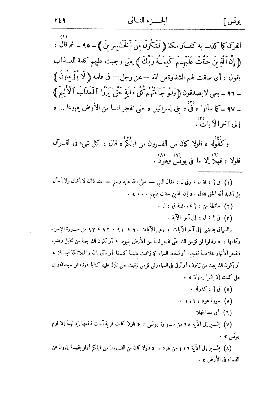 (8) يشير إلى الآية 116 من هود: فَلَوْلا كانَ مِنَ الْقُرُونِ مِنْ قَبْلِكُمْ أُولُوا بَقِيَّةٍ يَنْهَوْنَ عَنِ الْفَسادِ فِي الْأَرْضِ.
