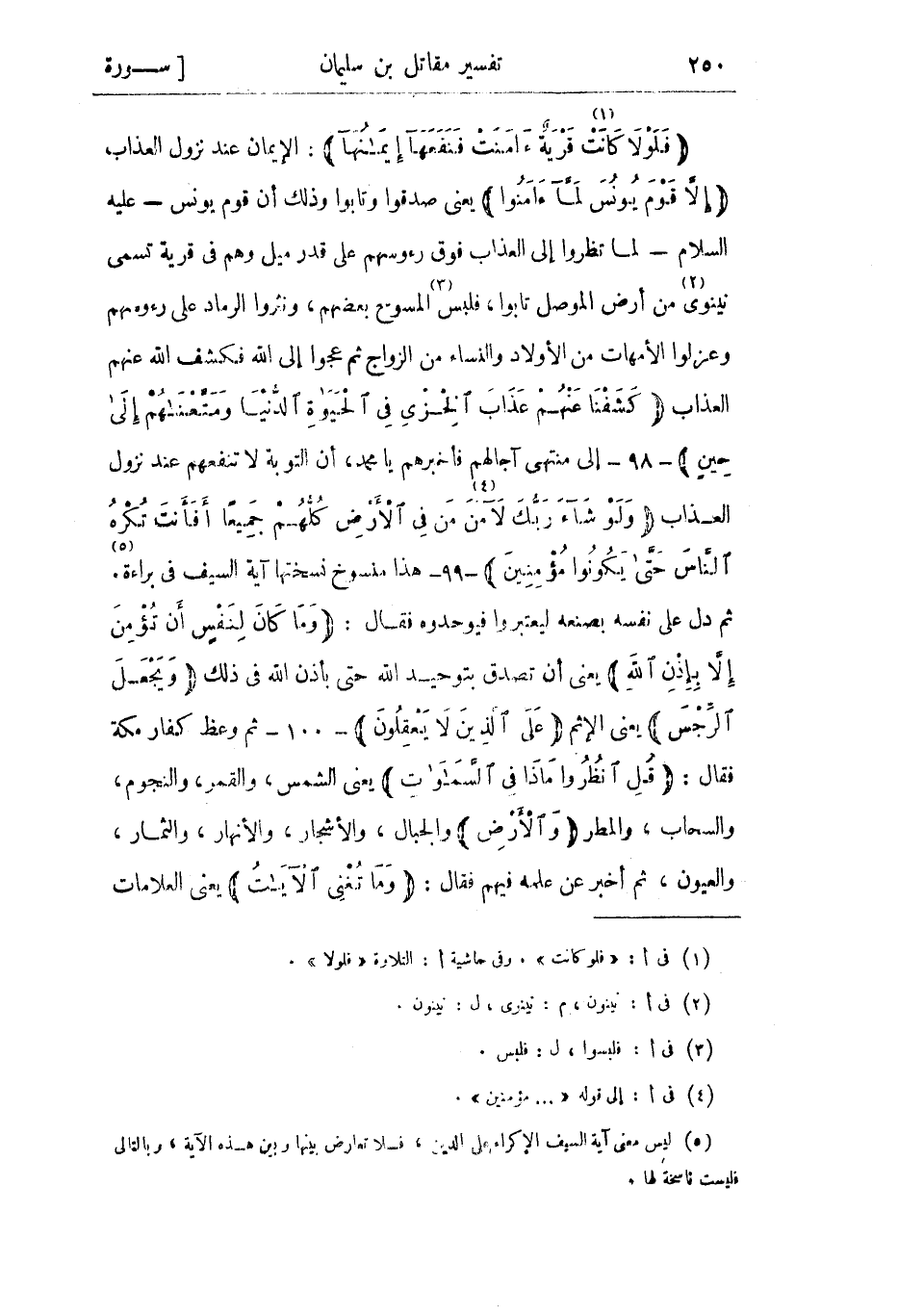 فَلَوْلا كانَتْ «1» قَرْيَةٌ آمَنَتْ فَنَفَعَها إِيمانُها: الإيمان عند نزول العذاب إِلَّا قَوْمَ يُونُسَ لَمَّا آمَنُوا يعني صدقوا وتابوا وذلك أن قوم يونس- عليه السلام- لما نظروا إلى العذاب فوق رءوسهم على قدر ميل وهم في قرية تسمى نينوى «2» من أرض الموصل تابوا، فلبس «3» المسوح بعضهم، ونثروا الرماد على رءوسهم وعزلوا الأمهات من الأولاد والنساء من الزواج ثم عجوا إلى الله فكشف الله عنهم العذاب كَشَفْنا عَنْهُمْ عَذابَ الْخِزْيِ فِي الْحَياةِ الدُّنْيا وَمَتَّعْناهُمْ إِلى حِينٍ- 98- إلى منتهى آجالهم فأخبرهم يا محمد، أن التوبة لا تنفعهم عند نزول العذاب وَلَوْ شاءَ رَبُّكَ لَآمَنَ «4» مَنْ فِي الْأَرْضِ كُلُّهُمْ جَمِيعاً أَفَأَنْتَ تُكْرِهُ النَّاسَ حَتَّى يَكُونُوا مُؤْمِنِينَ- 99- هذا منسوخ نسختها آية السيف في براءة «5» .