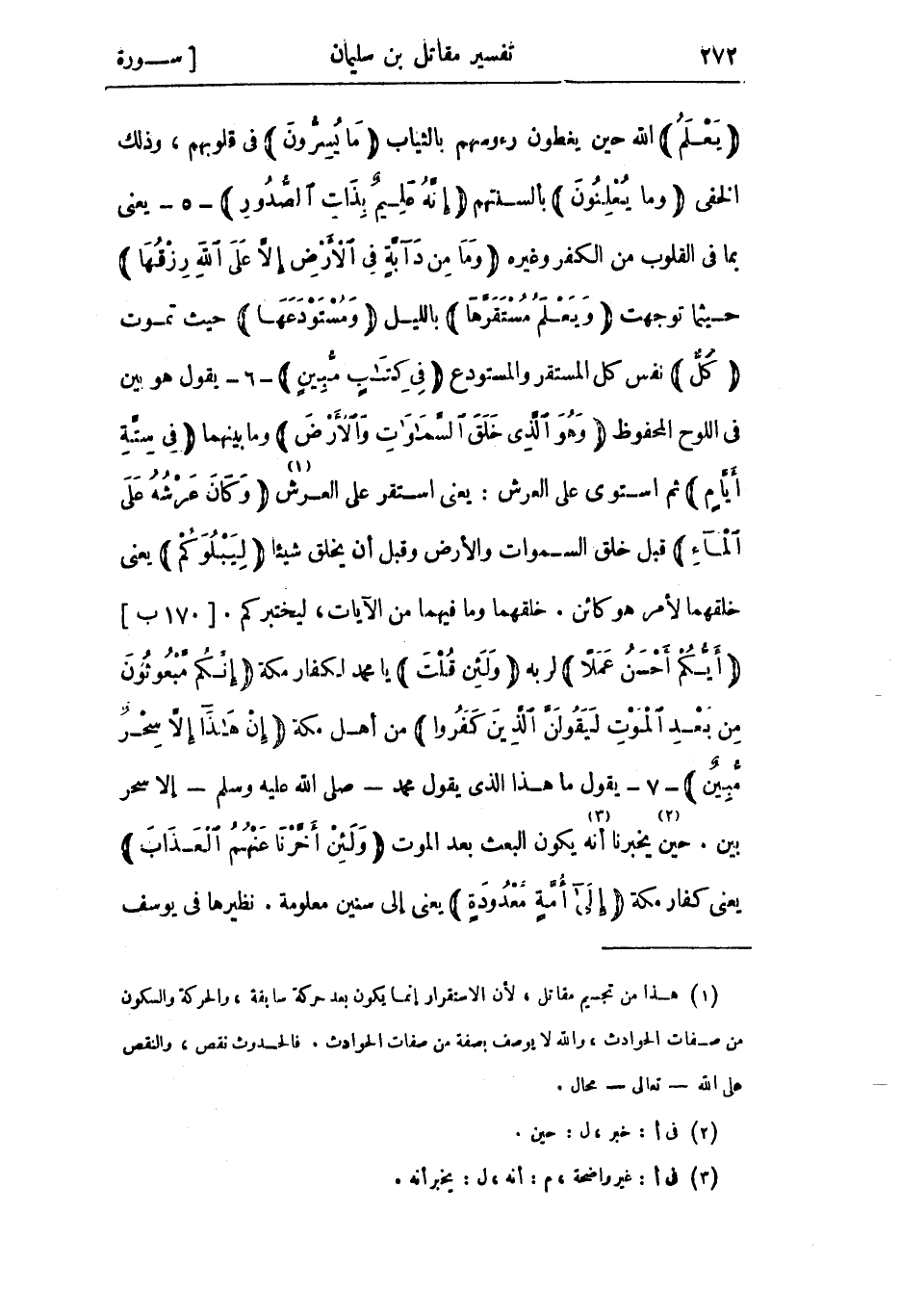 يَعْلَمُ الله حين يغطون رءوسهم بالثياب مَا يُسِرُّونَ في قلوبهم، وذلك الخفي وَما يُعْلِنُونَ بألسنتهم إِنَّهُ عَلِيمٌ بِذاتِ الصُّدُورِ- 5- يعني بما في القلوب من الكفر وغيره وَما مِنْ دَابَّةٍ فِي الْأَرْضِ إِلَّا عَلَى اللَّهِ رِزْقُها حيثما توجهت وَيَعْلَمُ مُسْتَقَرَّها بالليل وَمُسْتَوْدَعَها حيث تموت كُلٌّ نفس كل المستقر والمستودع فِي كِتابٍ مُبِينٍ- 6- يقول هو بين في اللوح المحفوظ وَهُوَ الَّذِي خَلَقَ السَّماواتِ وَالْأَرْضَ وَمَا بَيْنَهُمَا فِي سِتَّةِ أَيَّامٍ ثُمَّ استوى على العرش: يعني استقر على العرش «1» وَكانَ عَرْشُهُ عَلَى الْماءِ قبل خلق السموات والأرض وقبل أن يخلق شيئا لِيَبْلُوَكُمْ يعني خلقهما لأمر هو كائن. خلقهما وما فيهما من الآيات، ليختبركم. [170 ب] أَيُّكُمْ أَحْسَنُ عَمَلًا لربه وَلَئِنْ قُلْتَ يا محمد لكفار مكة إِنَّكُمْ مَبْعُوثُونَ مِنْ بَعْدِ الْمَوْتِ لَيَقُولَنَّ الَّذِينَ كَفَرُوا من أَهْل مكة إِنْ هَذَا إِلَّا سِحْرٌ مُبِينٌ- 7- يقول ما هَذَا الذي يقول محمد- صلى الله عليه وسلم- إلا سحر بين. حين «2» يخبرنا «3» أنه يكون البعث بعد الموت وَلَئِنْ أَخَّرْنا عَنْهُمُ الْعَذابَ يعنى كفار مكة إِلى أُمَّةٍ مَعْدُودَةٍ يعني إلى سنين معلومة. نظيرها في يوسف