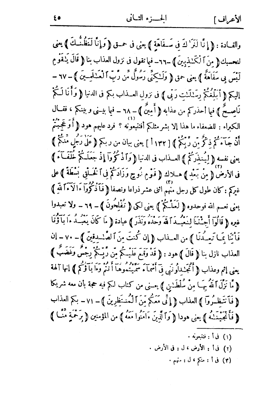 والقادة: إِنَّا لَنَراكَ فِي سَفاهَةٍ يعني في حمق وَإِنَّا لَنَظُنُّكَ يعني لنحسبك مِنَ الْكاذِبِينَ- 66- فيما تَقُولُ فِي نزول العذاب بنا قالَ يَا قَوْمِ لَيْسَ بِي سَفاهَةٌ يعني حمق وَلكِنِّي رَسُولٌ مِنْ رَبِّ الْعالَمِينَ- 67- إليكم أُبَلِّغُكُمْ رِسالاتِ رَبِّي فِي نزول العذاب بكم فِي الدُّنْيَا وَأَنَا لَكُمْ ناصِحٌ فيما أحذركم من عذابه أَمِينٌ- 68- فيما بيني وبينكم، فَقَالَ الكبراء: للضعفاء ما هَذَا إلا بشر مثلكم أفتتبعونه «1» ؟ فرد عليهم هود أَوَعَجِبْتُمْ أَنْ جاءَكُمْ ذِكْرٌ مِنْ رَبِّكُمْ [132 أ] يعني بيان من ربكم عَلى رَجُلٍ مِنْكُمْ يعني نفسه لِيُنْذِرَكُمْ العذاب فِي الدُّنْيَا وَاذْكُرُوا إِذْ جَعَلَكُمْ خُلَفاءَ فِي الأرض «2» مِنْ بَعْدِ هلاك قَوْمِ نُوحٍ وَزادَكُمْ فِي الْخَلْقِ بَصْطَةً عَلَى غيركم: كان طول كُلّ رَجُل منهم «3» اثنى عشر ذراعا ونصفا فَاذْكُرُوا آلاءَ اللَّهِ يعني نعم اللَّه فوحدوه لَعَلَّكُمْ يعني لكي تُفْلِحُونَ- 69- وَلا تعبدوا غيره قالُوا أَجِئْتَنا لِنَعْبُدَ اللَّهَ وَحْدَهُ وَنَذَرَ عبادة مَا كانَ يَعْبُدُ آباؤُنا فَأْتِنا بِما تَعِدُنا من العذاب إِنْ كُنْتَ مِنَ الصَّادِقِينَ- 70- إن العذاب نازل بنا قالَ هود: قَدْ وَقَعَ عَلَيْكُمْ مِنْ رَبِّكُمْ رِجْسٌ وَغَضَبٌ يعني إثم وعذاب أَتُجادِلُونَنِي فِي أَسْماءٍ سَمَّيْتُمُوها أَنْتُمْ وَآباؤُكُمْ أنها آلهة مَا نَزَّلَ اللَّهُ بِها مِنْ سُلْطانٍ يعني من كتاب لَكُمْ فِيهِ حجة بأن معه شريكا فَانْتَظِرُوا العذاب إِنِّي مَعَكُمْ مِنَ الْمُنْتَظِرِينَ- 71- بكم العذاب فَأَنْجَيْناهُ يعني هودا وَالَّذِينَ مَعَهُ من المؤمنين بِرَحْمَةٍ مِنَّا