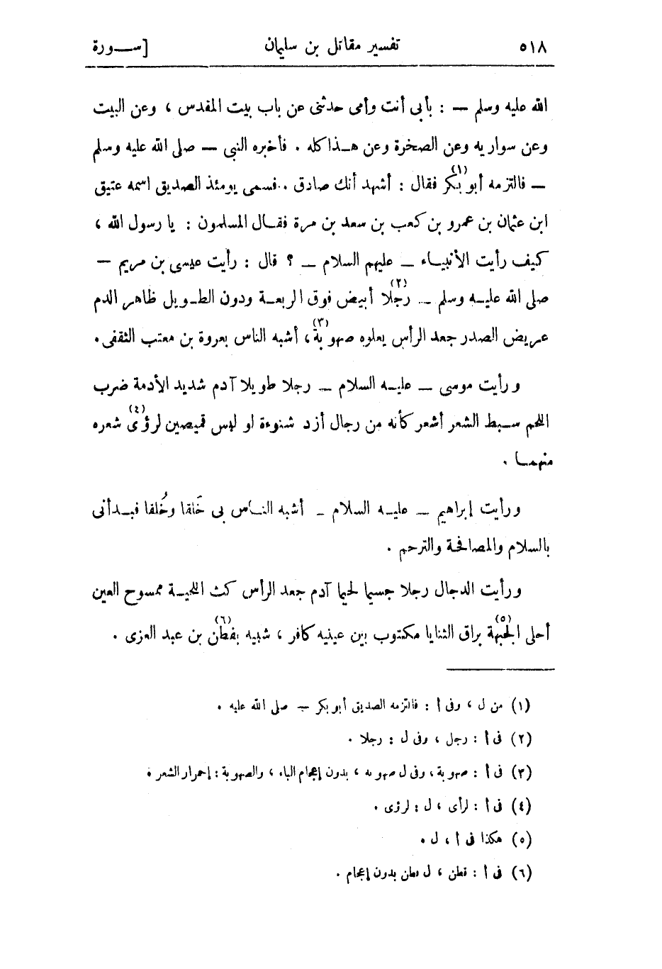 ورأيت موسى- عليه السلام- رجلا طويلا آدم شديد الأدمة ضرب اللحم سبط الشعر أشعر كأنه من رجال أزد شنوءة لو لبس قميصين لرؤى «4» شعره منهما.