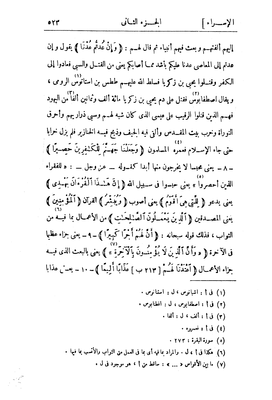 إليهم ألفتهم وبعث فيهم أنبياء ثم قال لهم: وَإِنْ عُدْتُمْ عُدْنا يقول وإن عدتم إلى المعاصي عدنا عليكم بأشد مما أصابكم يعني من القتل والسبي فعادوا إلى الكفر وقتلوا يحيى بن زكريا فسلط الله عليهم ططس بن استاتوس «1» الرومي، ويقال اصطفابوس «2» فقتل على دم يحيى بن زكريا مائة ألف وثمانين ألفا «3» من اليهود فهم الذين قتلوا الرقيب على عيسى الذي كان شبه لهم وسبى ذراريهم وأحرق التوراة وخرب بيت المقدس وألقى فيه الجيف وذبح فيه الخنازير فلم يزل خرابا حتى جاء الإسلام فعمره «4» المسلمون وَجَعَلْنا جَهَنَّمَ لِلْكافِرِينَ حَصِيراً- 8- يعني محبسا لا يخرجون منها أبدا كقوله- عز وجل-: «لِلْفُقَراءِ الَّذِينَ أُحْصِرُوا» «5» يعني حبسوا في سبيل الله إِنَّ هذَا الْقُرْآنَ يَهْدِي يعنى يدعو لِلَّتِي هِيَ أَقْوَمُ يعني أصوب وَيُبَشِّرُ القرآن الْمُؤْمِنِينَ يعني المصدقين الَّذِينَ يَعْمَلُونَ الصَّالِحاتِ من الأعمال بما فيه «6» من الثواب، فذلك قوله سبحانه: أَنَّ لَهُمْ أَجْراً كَبِيراً- 9- يعني جزاء عظيما في الآخرة «وَأَنَّ الَّذِينَ لا يُؤْمِنُونَ بِالْآخِرَةِ» «7» يعني بالبعث الذي فيه جزاء الأعمال أَعْتَدْنا لَهُمْ عَذاباً أَلِيماً [213 ب]- 10- يعنى عذابا