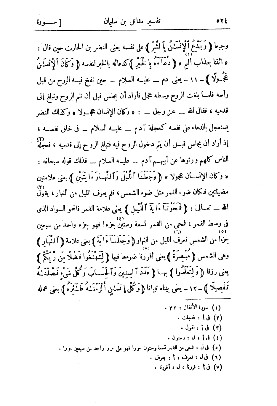 «وَكانَ الْإِنْسانُ عَجُولًا» وَجَعَلْنَا اللَّيْلَ وَالنَّهارَ آيَتَيْنِ يعني علامتين مضيئتين فكان ضوء القمر مثل ضوء الشمس، فلم يعرف الليل من النهار، يقول «3» الله- تعالى: فَمَحَوْنا آيَةَ اللَّيْلِ يعني علامة القمر فالمحو السواد الذي في وسط القمر، فمحى من القمر تسعة وستين «4» جزءا فهو جزء واحد من سبعين جزءا «5» من الشمس فعرف «6» الليل من النهار وَجَعَلْنا آيَةَ يعني علامة النَّهارَ وهي الشمس مُبْصِرَةً يعني أقررنا «7» ضوءها فيها لِتَبْتَغُوا فَضْلًا مِنْ رَبِّكُمْ يعني رزقا وَلِتَعْلَمُوا بها عَدَدَ السِّنِينَ وَالْحِسابَ وَكُلَّ شَيْءٍ فَصَّلْناهُ تَفْصِيلًا- 12- يعني بيناه تبيانا وَكُلَّ إِنسانٍ أَلْزَمْناهُ طائِرَهُ يعنى عمله