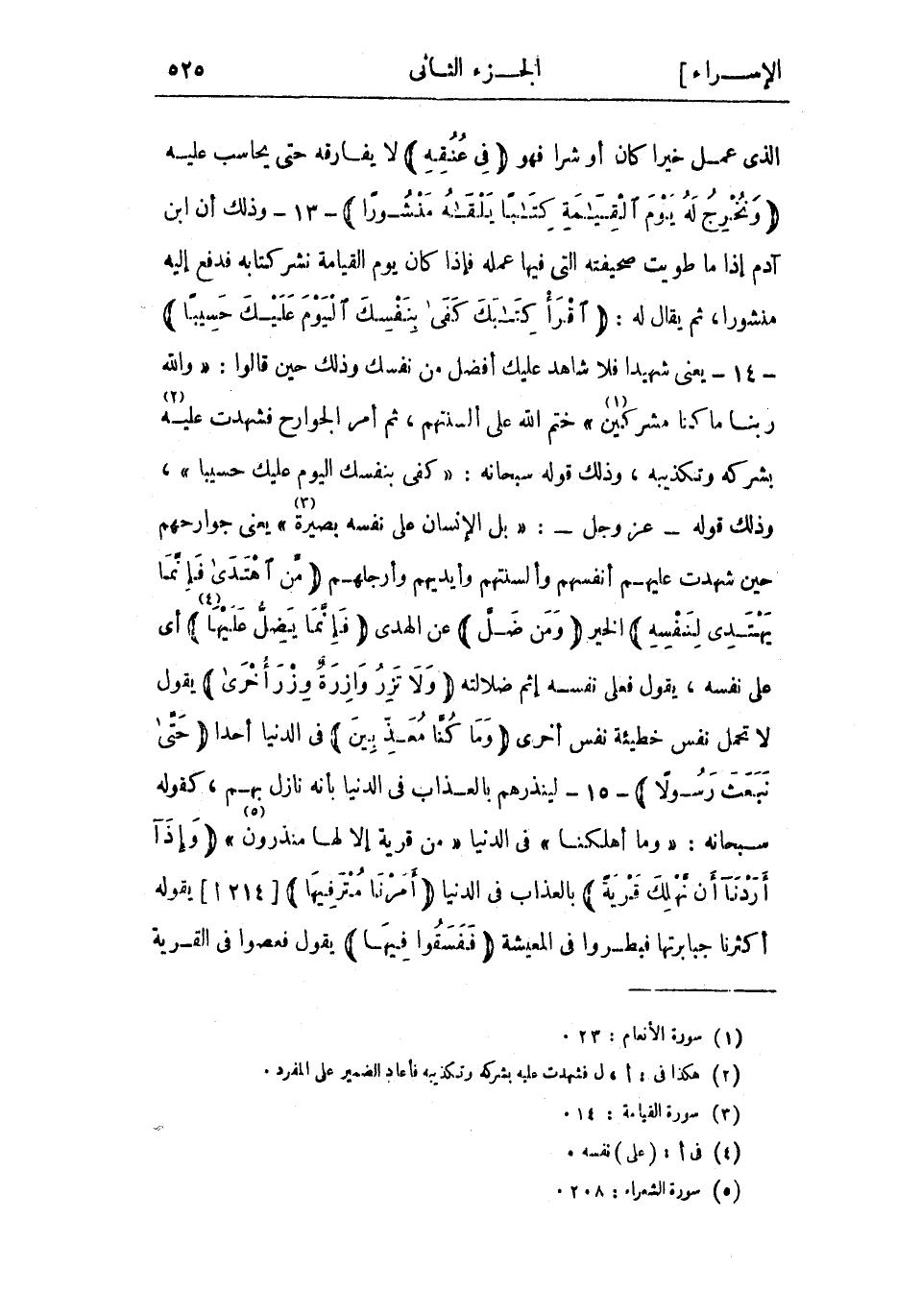 «3» يعني جوارحهم حين شهدت عليهم أنفسهم وألسنتهم وأيديهم وأرجلهم مَنِ اهْتَدى فَإِنَّما يَهْتَدِي لِنَفْسِهِ الخير وَمَنْ ضَلَّ عن الهدى فَإِنَّما يَضِلُّ عَلَيْها «4» أي على نفسه، يقول فعلى نفسه إثم ضلالته وَلا تَزِرُ وازِرَةٌ وِزْرَ أُخْرى يقول لا تحمل نفس خطيئة نفس أخرى وَما كُنَّا مُعَذِّبِينَ فى الدنيا أحدا حَتَّى نَبْعَثَ رَسُولًا- 15- لينذرهم بالعذاب في الدنيا بأنه نازل بهم، كقوله سبحانه: وَما أَهْلَكْنا في الدنيا مِنْ قَرْيَةٍ إِلَّا لَها مُنْذِرُونَ «5» وَإِذا أَرَدْنا أَنْ نُهْلِكَ قَرْيَةً