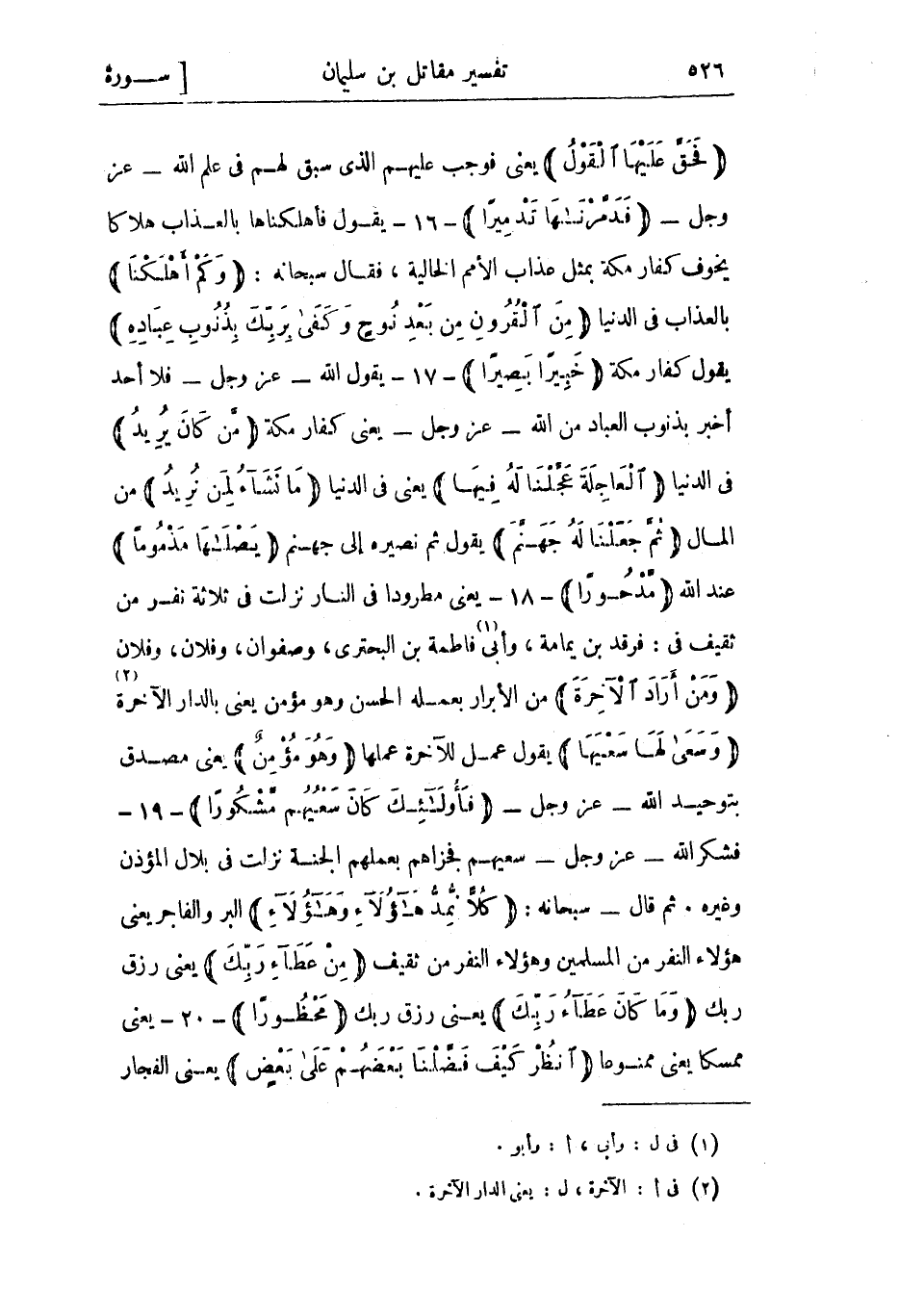 - 16- يقول فأهلكناها بالعذاب هلاكا يخوف كفار مكة بمثل عذاب الأمم الخالية، فقال سبحانه: وَكَمْ أَهْلَكْنا بالعذاب في الدنيا مِنَ الْقُرُونِ مِنْ بَعْدِ نُوحٍ وَكَفى بِرَبِّكَ بِذُنُوبِ عِبادِهِ يقول كفار مكة خَبِيراً بَصِيراً- 17- يقول الله- عز وجل- فلا أحد أخبر بذنوب العباد من الله- عز وجل- يعني كفار مكة مَنْ كانَ يُرِيدُ فى الدنيا الْعاجِلَةَ عَجَّلْنا لَهُ فِيها يعني في الدنيا مَا نَشاءُ لِمَنْ نُرِيدُ من المال ثُمَّ جَعَلْنا لَهُ جَهَنَّمَ يقول ثم نصيره إلى جهنم يَصْلاها مَذْمُوماً عند الله مَدْحُوراً- 18- يعني مطرودا في النار نزلت في ثلاثة نفر من ثقيف في: فرقد بن يمامة، وأبى «1» فاطمة بن البختري، وصفوان، وفلان، وفلان وَمَنْ أَرادَ الْآخِرَةَ من الأبرار بعمله الحسن وهو مؤمن يعني بالدار الآخرة «2» وَسَعى لَها سَعْيَها يقول عمل للآخرة عملها وَهُوَ مُؤْمِنٌ يعني مصدق بتوحيد الله- عز وجل- فَأُولئِكَ كانَ سَعْيُهُمْ مَشْكُوراً- 19- فشكر الله- عز وجل- سعيهم فجزاهم بعملهم الجنة نزلت في بلال المؤذن وغيره. ثم قال- سبحانه: كُلًّا نُمِدُّ هؤُلاءِ وَهَؤُلاءِ البر والفاجر يعني هؤلاء النفر من المسلمين وهؤلاء النفر من ثقيف مِنْ عَطاءِ رَبِّكَ يعني رزق ربك وَما كانَ عَطاءُ رَبِّكَ يعني رزق ربك مَحْظُوراً- 20- يعني ممسكا يعني ممنوعا انْظُرْ كَيْفَ فَضَّلْنا بَعْضَهُمْ عَلى بَعْضٍ يعنى الفجار