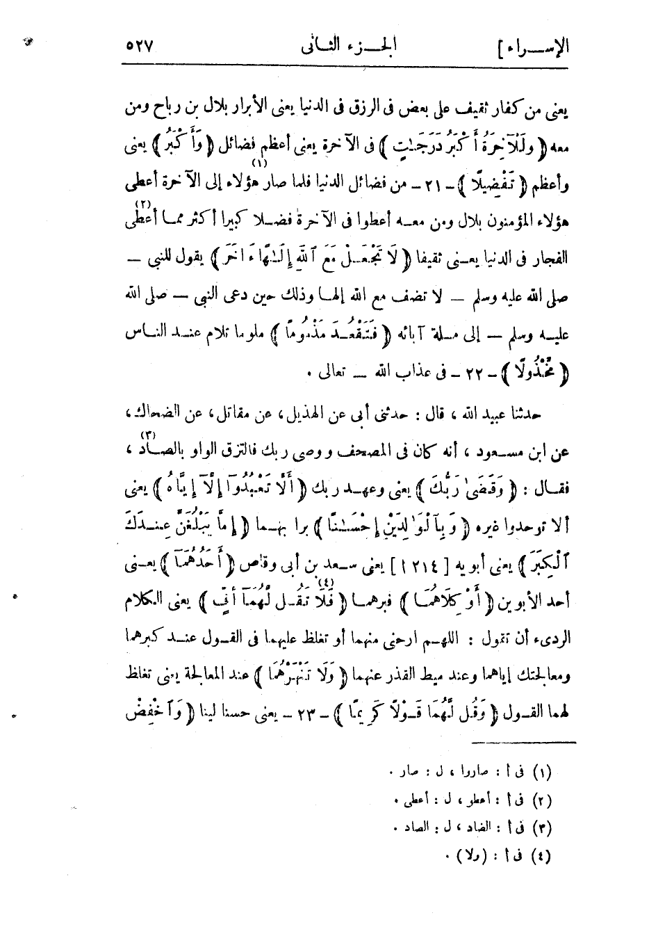 حدثنا عبيد اللَّهِ، قَالَ: حَدَّثَنِي أَبِي عَنِ الْهُذَيْلِ، عَنْ مقاتل، عن الضحاك، عن ابن مَسْعُودٍ، أَنَّهُ كَانَ فِي الْمُصْحَفِ وَوَصَّى رَبُّكَ فالتزق الواو بالصاد «3» ، فقال: وَقَضى رَبُّكَ يَعْنِي وَعَهِدَ رَبُّكَ أَلَّا تَعْبُدُوا إِلَّا إِيَّاهُ يَعْنِي أَلا تُوَحِّدُوا غَيْرَهُ وَبِالْوالِدَيْنِ إِحْساناً بِرًّا بهما إِمَّا يَبْلُغَنَّ عِنْدَكَ الْكِبَرَ يعنى أبويه [214 أ] يَعْنِي سَعْدَ بْنَ أَبِي وَقَّاصٍ أَحَدُهُما يَعْنِي أَحَدَ الأَبَوَيْنِ أَوْ كِلاهُما فَبَرَّهُمَا فَلا «4» تَقُلْ لَهُما أُفٍّ يَعْنِي الْكَلامَ الرَّدِيءَ أَنْ تَقُولَ: اللَّهُمَّ أَرِحْنِي مِنْهُمَا أَوْ تُغْلِظُ عَلَيْهِمَا فِي الْقَوْلِ عِنْدَ كبرهما ومعالجتك إياهما وعند ميط الْقَذَرِ عَنْهُمَا وَلا تَنْهَرْهُما عِنْدَ الْمُعَالَجَةِ يَعْنِي تُغْلِظُ لَهُمَا الْقَوْلَ وَقُلْ لَهُما قَوْلًا كَرِيماً- 23- يعنى حسنا لينا