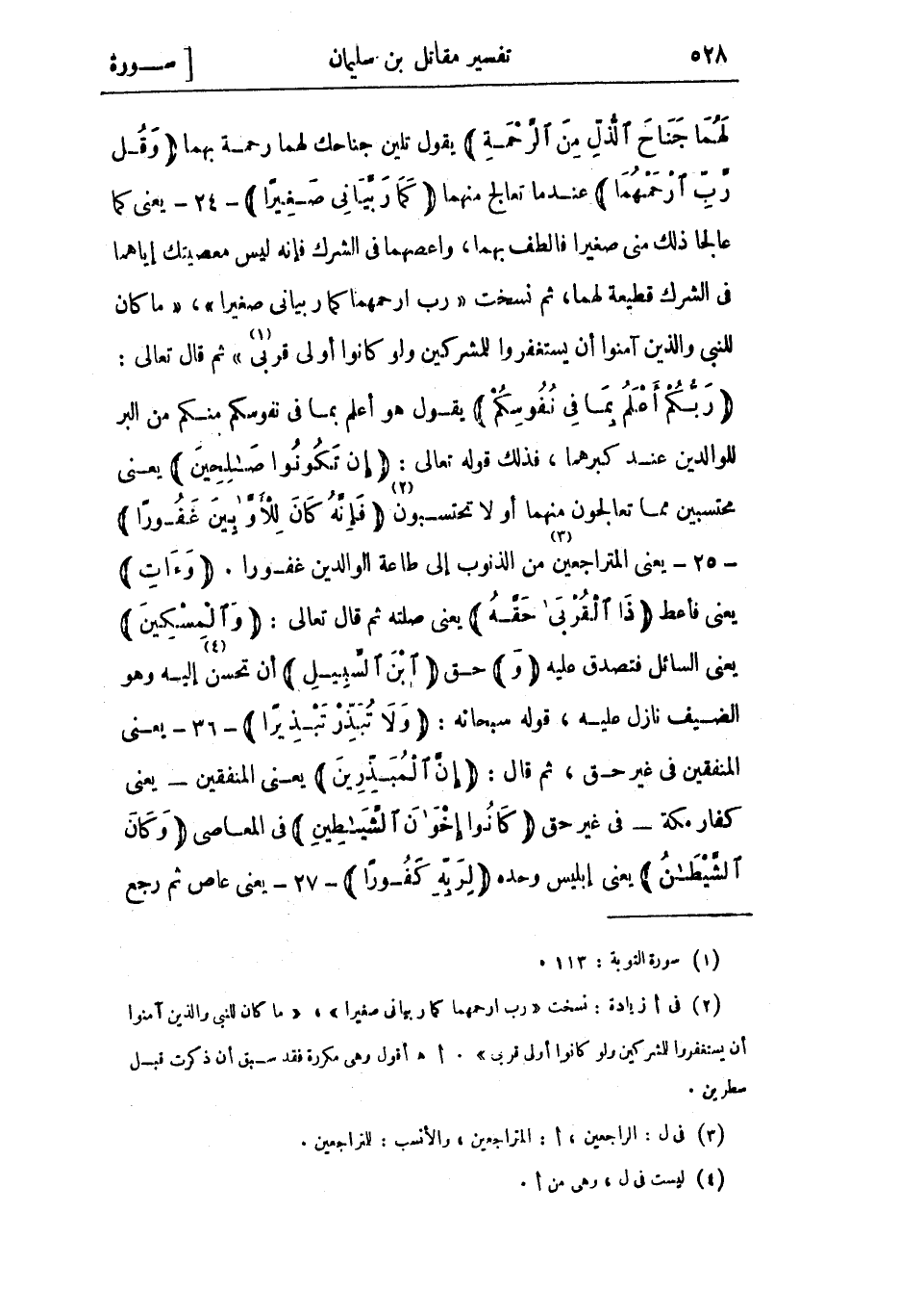 وَاخْفِضْ لَهُما جَناحَ الذُّلِّ مِنَ الرَّحْمَةِ يقول تلين جناحك لهما رحمة بهما وَقُلْ رَبِّ ارْحَمْهُما عند ما تعالج منهما كَما رَبَّيانِي صَغِيراً- 24- يعنى كما عالجا ذلك منى صغيرا فالطف بهما، واعصهما في الشرك فإنه ليس معصيتك إياهما في الشرك قطيعة لهما، ثم نسخت رَبِّ ارْحَمْهُما كَما رَبَّيانِي صَغِيراً، مَا كانَ لِلنَّبِيِّ وَالَّذِينَ آمَنُوا أَنْ يَسْتَغْفِرُوا لِلْمُشْرِكِينَ وَلَوْ كانُوا أُولِي قُرْبى «1» ثم قال تعالى: