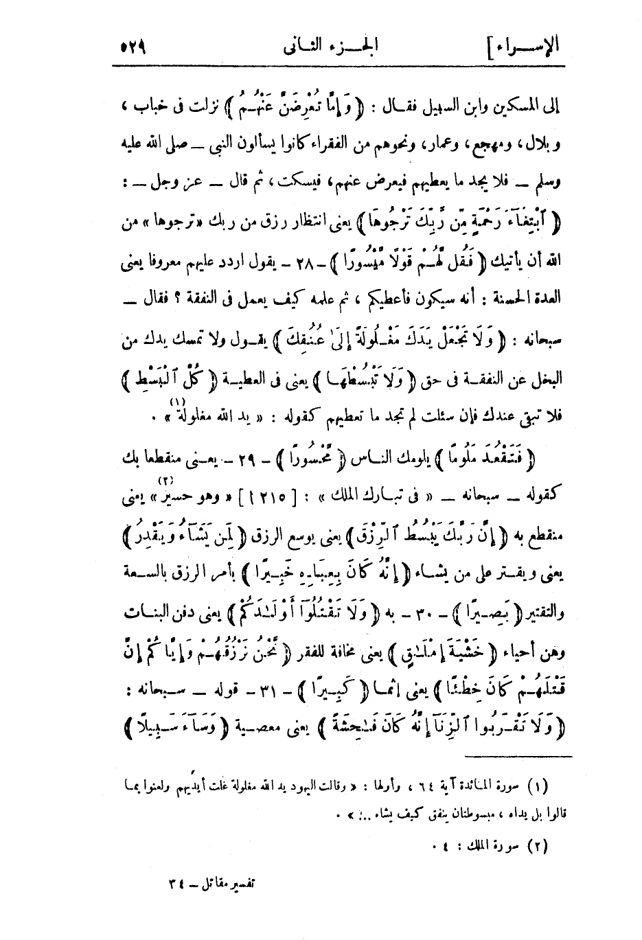 فَتَقْعُدَ مَلُوماً يلومك الناس مَحْسُوراً- 29- يعني منقطعا بك كقوله- سبحانه- «فى تبارك الملك» : [215 أ] وَهُوَ حَسِيرٌ «2» يعني منقطع به إِنَّ رَبَّكَ يَبْسُطُ الرِّزْقَ يعنى يوسع الرزق لِمَنْ يَشاءُ وَيَقْدِرُ يعني ويقتر على من يشاء إِنَّهُ كانَ بِعِبادِهِ خَبِيراً بأمر الرزق بالسعة والتقتير بَصِيراً- 30- به وَلا تَقْتُلُوا أَوْلادَكُمْ يعني دفن البنات وهن أحياء خَشْيَةَ إِمْلاقٍ يعني مخافة للفقر نَحْنُ نَرْزُقُهُمْ وَإِيَّاكُمْ إِنَّ قَتْلَهُمْ كانَ خِطْأً يعني إثما كَبِيراً- 31- قوله- سبحانه: