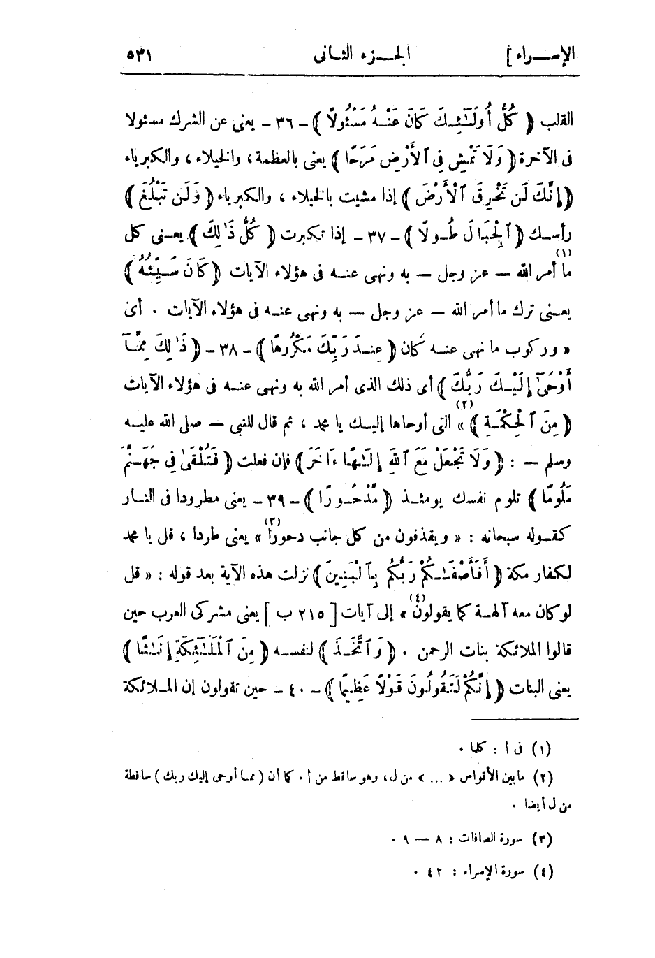 القلب كُلُّ أُولئِكَ كانَ عَنْهُ مَسْؤُلًا- 36- يعني عن الشرك مسئولا في الآخرة وَلا تَمْشِ فِي الْأَرْضِ مَرَحاً يعني بالعظمة، والخيلاء، والكبرياء إِنَّكَ لَنْ تَخْرِقَ الْأَرْضَ إذا مشيت بالخيلاء، والكبرياء وَلَنْ تَبْلُغَ رأسك الْجِبالَ طُولًا- 37- إذا تكبرت كُلُّ ذلِكَ يعنى كل ما «1» أمر الله- عز وجل- به ونهى عنه في هؤلاء الآيات كانَ سَيِّئُهُ يعني ترك ما أمر الله- عز وجل- به ونهى عنه في هؤلاء الآيات. أي «وركوب ما نهى عنه كان عِنْدَ رَبِّكَ مَكْرُوهاً- 38- ذلِكَ مِمَّا أَوْحى إِلَيْكَ رَبُّكَ أي ذلك الذي أمر الله به ونهى عنه في هؤلاء الآيات مِنَ الْحِكْمَةِ «2» » التي أوحاها إليك يا محمد، ثم قال للنبي- صلى الله عليه وسلم-: وَلا تَجْعَلْ مَعَ اللَّهِ إِلهاً آخَرَ فإن فعلت فَتُلْقى فِي جَهَنَّمَ مَلُوماً تلوم نفسك يومئذ مَدْحُوراً- 39- يعني مطرودا في النار كقوله سبحانه: وَيُقْذَفُونَ مِنْ كُلِّ جانِبٍ دُحُوراً «3» يعني طردا، قل يا محمد لكفار مكة أَفَأَصْفاكُمْ رَبُّكُمْ بِالْبَنِينَ نزلت هذه الآية بعد قوله: قُلْ لَوْ كانَ مَعَهُ آلِهَةٌ كَما يَقُولُونَ «4» إلى آيات [215 ب] يعني مشركي العرب حين قالوا الملائكة بنات الرحمن. وَاتَّخَذَ لنفسه مِنَ الْمَلائِكَةِ إِناثاً يعنى البنات إِنَّكُمْ لَتَقُولُونَ قَوْلًا عَظِيماً- 40- حين تقولون إن الملائكة