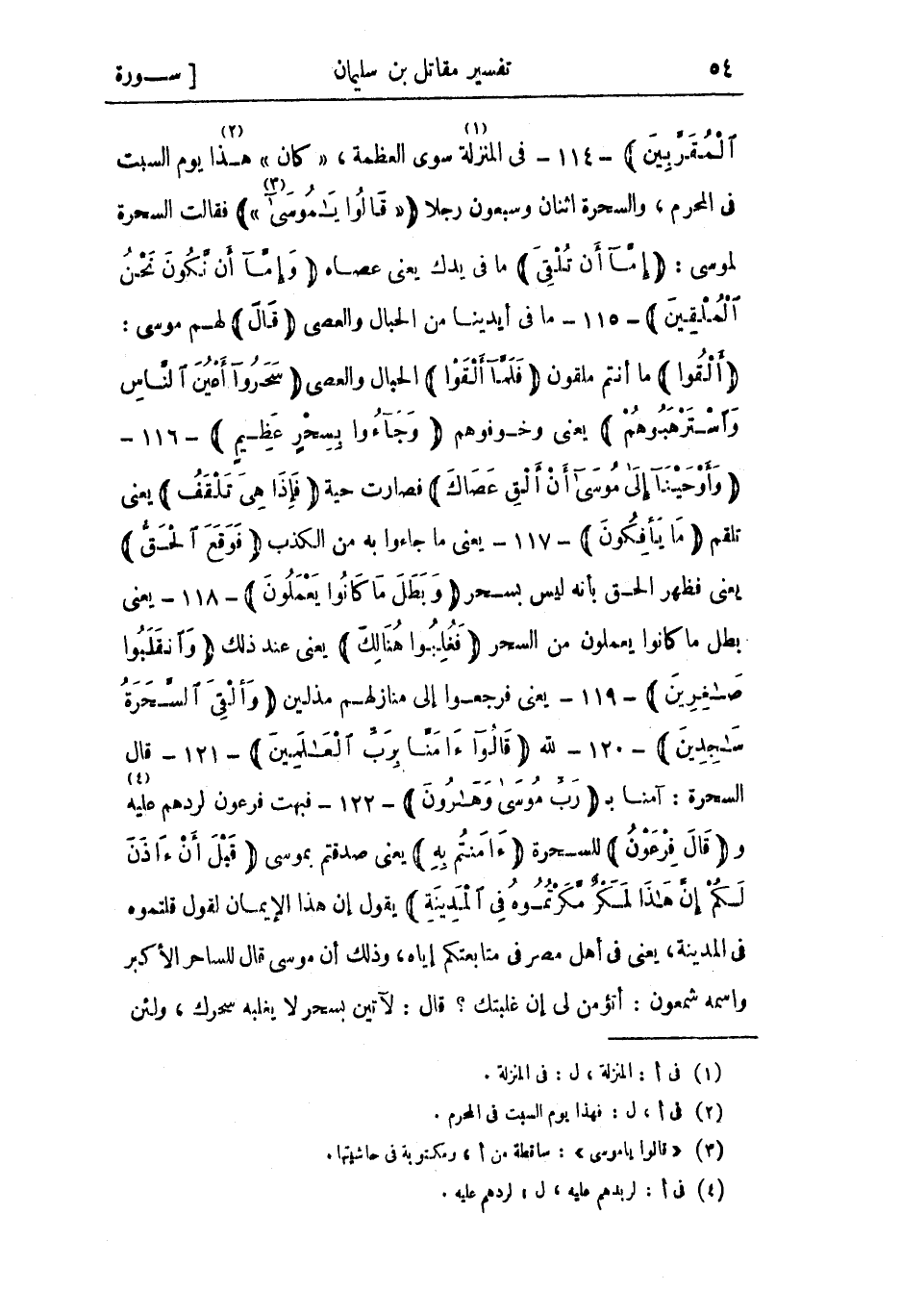 - 114- فِي المنزلة «1» سوى العظمة، «كان» هَذَا «2» يوم السبت فِي المحرم، والسحرة اثنان وسبعون رَجُلا «قالُوا يا مُوسى» «3» فقالت السحرة لموسى: إِمَّا أَنْ تُلْقِيَ ما فِي يدك يعني عصاه وَإِمَّا أَنْ نَكُونَ نَحْنُ الْمُلْقِينَ- 115- ما فِي أيدينا من الحبال والعصي قالَ لَهُمْ مُوسَى: