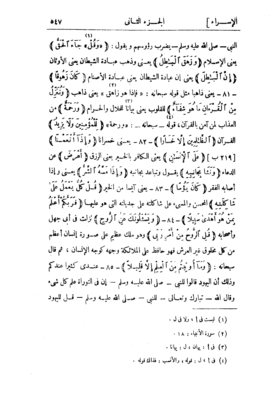 النبي- صلى الله عليه وسلم- يضرب رؤوسهم ويقول: «وَقُلْ» «1» جاءَ الْحَقُّ يعني الإسلام وَزَهَقَ الْباطِلُ يعني وذهب عبادة الشيطان يعني الأوثان إِنَّ الْباطِلَ يعني إن عبادة الشيطان يعني عبادة الأصنام كانَ زَهُوقاً- 81- يعني ذاهبا مثل قوله سبحانه: فَإِذا هُوَ زاهِقٌ «2» يعنى ذاهب وَنُنَزِّلُ مِنَ الْقُرْآنِ ما هُوَ شِفاءٌ للقلوب يعني بيانا «3» للحلال والحرام وَرَحْمَةٌ من العذاب لمن آمن بالقرآن، قوله «4» - سبحانه-: «وَرَحْمَةٌ» لِلْمُؤْمِنِينَ وَلا يَزِيدُ القرآن الظَّالِمِينَ إِلَّا خَساراً- 82- يعنى خسرانا وَإِذا أَنْعَمْنا [219 ب] عَلَى الْإِنْسانِ يعني الكافر بالخير يعني الرزق أَعْرَضَ عن الدعاء وَنَأى بِجانِبِهِ يقول وتباعد بجانبه وَإِذا مَسَّهُ الشَّرُّ يعنى وإذا أصابه الفقر كانَ يَؤُساً- 83- يعني آيسا من الخير قُلْ كُلٌّ يَعْمَلُ عَلى شاكِلَتِهِ المحسن والمسيء على شاكلته على جديلته التي هو عليها فَرَبُّكُمْ أَعْلَمُ بِمَنْ هُوَ أَهْدى سَبِيلًا- 84- وَيَسْئَلُونَكَ عَنِ الرُّوحِ نزلت في أبي جهل وأصحابه قُلِ الرُّوحُ مِنْ أَمْرِ رَبِّي وهو ملك عظيم على صورة إنسان أعظم من كل مخلوق غير العرش فهو حافظ على الملائكة وجهه كوجه الإنسان، ثم قال سبحانه: وَما أُوتِيتُمْ مِنَ الْعِلْمِ إِلَّا قَلِيلًا- 85- عندي كثيرا عندكم وذلك أن اليهود قالوا للنبي- صلى الله عليه وسلم- إن في التوراة علم كل شيء وقال الله- تبارك وتعالى- للنبي- صلى الله عليه وسلم- قل لليهود