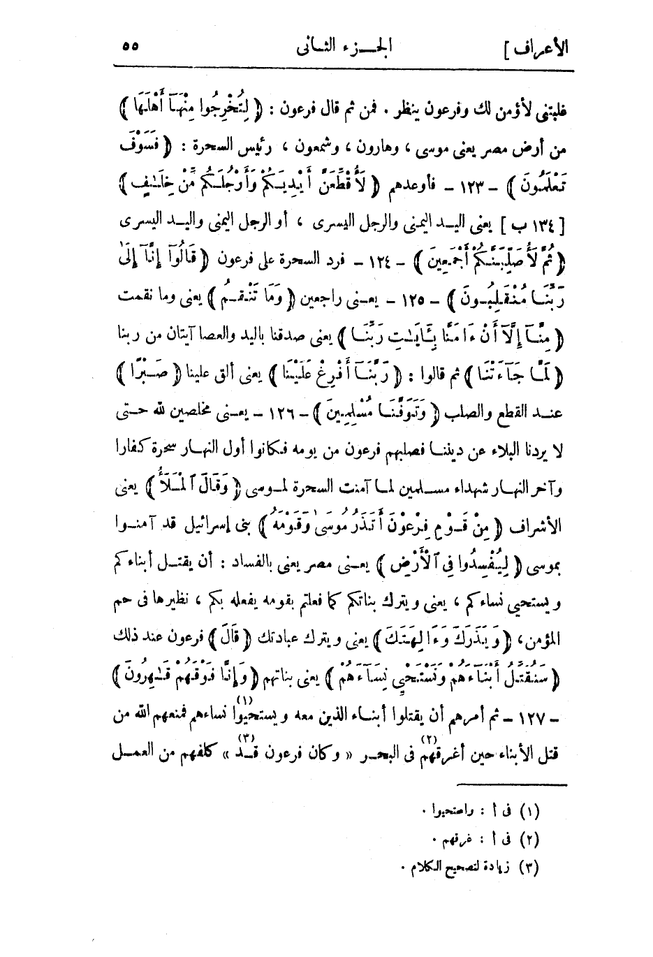 غلبتني لأؤمن لك وفرعون ينظر. فَمنْ ثُمّ قال فرعون: لِتُخْرِجُوا مِنْها أَهْلَها من أرض مصر يعني مُوسَى، وهارون، وشمعون، رئيس السحرة: فَسَوْفَ تَعْلَمُونَ- 123- فأوعدهم لَأُقَطِّعَنَّ أَيْدِيَكُمْ وَأَرْجُلَكُمْ مِنْ خِلافٍ [134 ب] يعني اليد اليمنى والرجل اليسرى، أَو الرَّجُل اليمنى واليد اليسرى ثُمَّ لَأُصَلِّبَنَّكُمْ أَجْمَعِينَ- 124- فرد السحرة عَلَى فرعون قالُوا إِنَّا إِلى رَبِّنا مُنْقَلِبُونَ- 125- يعني راجعين وَما تَنْقِمُ يعني وما نقمت مِنَّا إِلَّا أَنْ آمَنَّا بِآياتِ رَبِّنا يعني صدقنا باليد والعصا آيتان من ربنا لَمَّا جاءَتْنا ثُمّ قَالُوا: رَبَّنا أَفْرِغْ عَلَيْنا يعنى ألق علينا صَبْراً عِنْد القطع والصلب وَتَوَفَّنا مُسْلِمِينَ- 126- يعني مخلصين للَّه حَتَّى لا يردنا البلاء عن ديننا فصلبهم فرعون من يومه فكانوا أول النهار سحرة كفارا وآخر النهار شهداء مسلمين لما آمنت السحرة لموسى وَقالَ الْمَلَأُ يعني الأشراف مِنْ قَوْمِ فِرْعَوْنَ أَتَذَرُ مُوسى وَقَوْمَهُ بني إِسْرَائِيل قَدْ آمنوا بموسى لِيُفْسِدُوا فِي الْأَرْضِ يعني مصر يعني بالفساد: أن يقتل أبناءكم ويستحيى نساءكم، يعني ويترك بناتكم كَمَا فعلتم بقومه يفعله بكم، نظيرها فِي حم الْمُؤْمِن، وَيَذَرَكَ وَآلِهَتَكَ يعني ويترك عبادتك قالَ فرعون عِنْد ذلك سَنُقَتِّلُ أَبْناءَهُمْ وَنَسْتَحْيِي نِساءَهُمْ يعنى بناتهم وَإِنَّا فَوْقَهُمْ قاهِرُونَ- 127- ثُمّ أمرهم أن يقتلوا أبناء الَّذِين معه ويستحيوا «1» نساءهم فمنعهم اللَّه من قتل الأبناء حين أغرقهم «2» فِي البحر «وكان فرعون قَدْ «3» » كلفهم من العمل