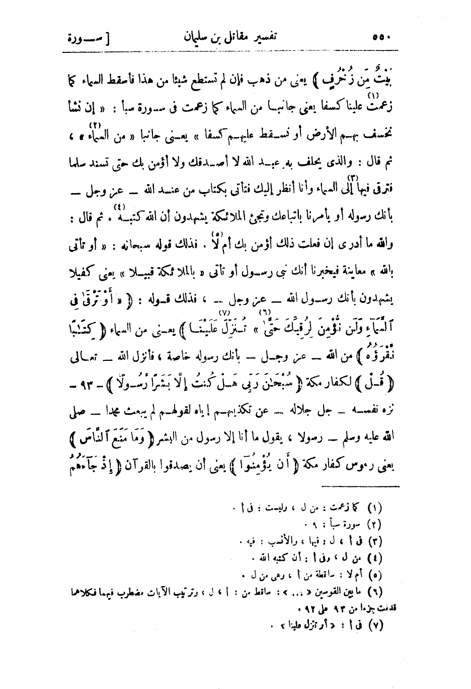 يعني من ذهب فإن لم تستطع شيئا من هذا فأسقط السماء كما زعمت «1» علينا كسفا يعني جانبا من السماء كما زعمت فى سورة سبأ: إِنْ نَشَأْ نَخْسِفْ بِهِمُ الْأَرْضَ أَوْ نُسْقِطْ عَلَيْهِمْ كِسَفاً يعني جانبا مِنَ السَّماءِ «2» ، ثم قال: والذي يحلف به عبد الله لا أصدقك ولا أؤمن بك حتى تسند سلما فترقى فيها «3» إلى السماء وأنا أنظر إليك فتأتي بكتاب من عند الله- عز وجل- بأنك رسوله أو يأمرنا باتباعك وتجيء الملائكة يشهدون أن الله كتبه «4» . ثم قال: