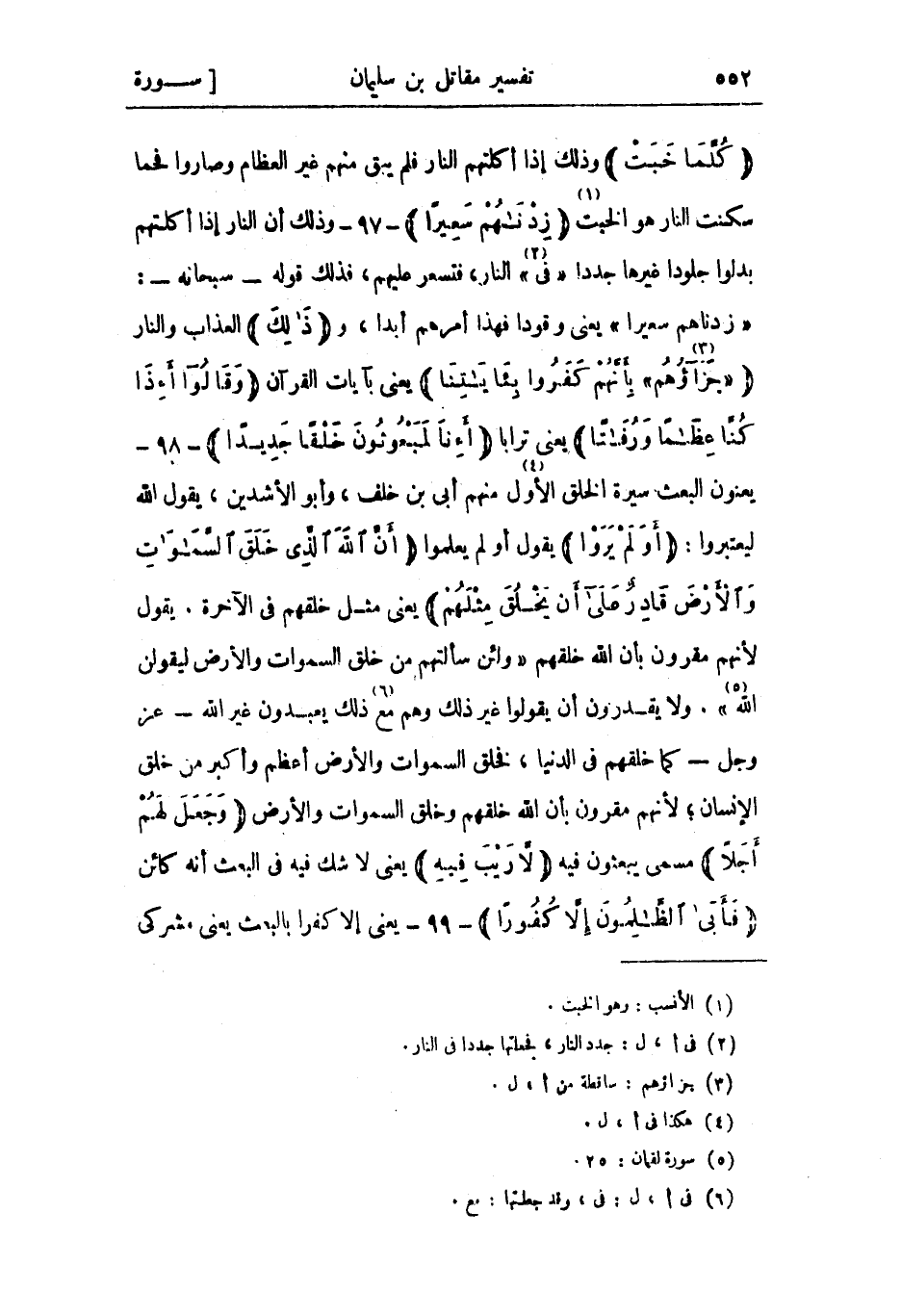 - 98- يعنون البعث سيرة الخلق الأول «4» منهم أبي بن خلف، وأبو الأشدين، يقول الله ليعتبروا: أَوَلَمْ يَرَوْا يقول أو لم يعلموا أَنَّ اللَّهَ الَّذِي خَلَقَ السَّماواتِ وَالْأَرْضَ قادِرٌ عَلى أَنْ يَخْلُقَ مِثْلَهُمْ يعني مثل خلقهم في الآخرة. يقول لأنهم مقرون بأن الله خلقهم وَلَئِنْ سَأَلْتَهُمْ مَنْ خَلَقَ السَّماواتِ وَالْأَرْضَ لَيَقُولُنَّ اللَّهُ «5» . ولا يقدرون أن يقولوا غير ذلك وهم مع «6» ذلك يعبدون غير الله- عز وجل- كما خلقهم في الدنيا، فخلق السموات والأرض أعظم وأكبر من خلق الإنسان لأنهم مقرون بأن الله خلقهم وخلق السموات والأرض وَجَعَلَ لَهُمْ أَجَلًا مسمى يبعثون فيه لا رَيْبَ فِيهِ يعني لا شك فيه في البعث أنه كائن فَأَبَى الظَّالِمُونَ إِلَّا كُفُوراً- 99- يعنى إلا كفرا بالبعث يعنى مشركي