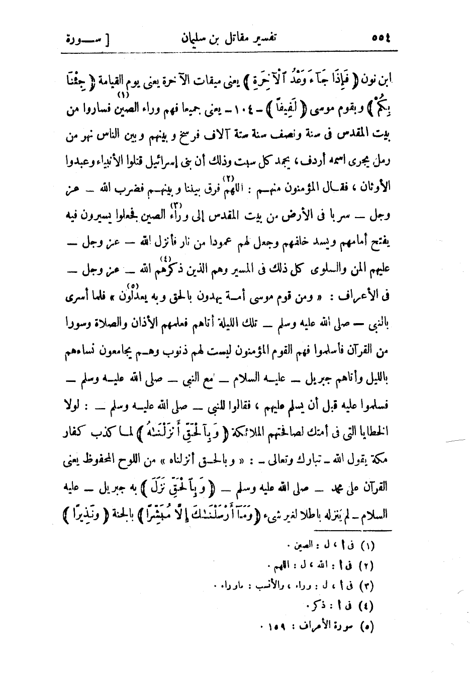 ابن نون فَإِذا جاءَ وَعْدُ الْآخِرَةِ يعني ميقات الآخرة يعني يوم القيامة جِئْنا بِكُمْ وبقوم موسى لَفِيفاً- 104- يعني جميعا فهم وراء الصين «1» فساروا من بيت المقدس في سنة ونصف سنة ستة آلاف فرسخ وبينهم وبين الناس نهر من رمل يجري اسمه أردف، يجمد كل سبت وذلك أن بني إسرائيل قتلوا الأنبياء وعبدوا الأوثان، فقال المؤمنون منهم: اللهم «2» فرق بيننا وبينهم فضرب الله- عز وجل- سربا في الأرض من بيت المقدس إلى وراء «3» الصين فجعلوا يسيرون فيه يفتح أمامهم ويسد خلفهم وجعل لهم عمودا من نار فأنزل الله- عز وجل- عليهم المن والسلوى كل ذلك في المسير وهم الذين ذكرهم «4» الله- عز وجل- في الأعراف: وَمِنْ قَوْمِ مُوسى أُمَّةٌ يَهْدُونَ بِالْحَقِّ وَبِهِ يَعْدِلُونَ «5» فلما أسرى بالنبي- صلى الله عليه وسلم- تلك الليلة أتاهم فعلمهم الأذان والصلاة وسورا من القرآن فأسلموا فهم القوم المؤمنون ليست لهم ذنوب وهم يجامعون نساءهم بالليل وأتاهم جبريل- عليه السلام- مع النبي- صلى الله عليه وسلم- فسلموا عليه قبل أن يسلم عليهم، فقالوا للنبي- صلى الله عليه وسلم-: لولا الخطايا التي في أمتك لصافحتهم الملائكة وَبِالْحَقِّ أَنْزَلْناهُ لما كذب كفار مكة يقول الله- تبارك وتعالى-: وَبِالْحَقِّ أَنْزَلْناهُ من اللوح المحفوظ يعني القرآن على محمد- صلى الله عليه وسلم- وَبِالْحَقِّ نَزَلَ به جبريل- عليه السلام- لم ينزله باطلا لغير شيء وَما أَرْسَلْناكَ إِلَّا مُبَشِّراً بالجنة وَنَذِيراً