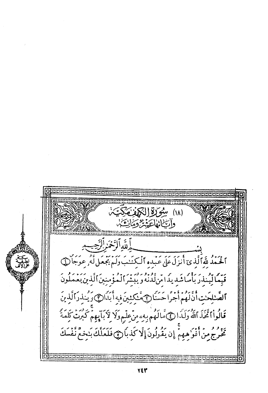 الْحَمْدُ لِلَّهِ الَّذِي أَنْزَلَ عَلى عَبْدِهِ الْكِتابَ وَلَمْ يَجْعَلْ لَهُ عِوَجاً (1) قَيِّماً لِيُنْذِرَ بَأْساً شَدِيداً مِنْ لَدُنْهُ وَيُبَشِّرَ الْمُؤْمِنِينَ الَّذِينَ يَعْمَلُونَ الصَّالِحاتِ أَنَّ لَهُمْ أَجْراً حَسَناً (2) ماكِثِينَ فِيهِ أَبَداً (3) وَيُنْذِرَ الَّذِينَ قالُوا اتَّخَذَ اللَّهُ وَلَداً (4)