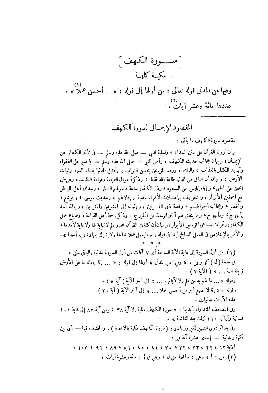 (1) المقصود الإجمالى لسورة الكهف مقصود سورة الكهف ما يأتى: