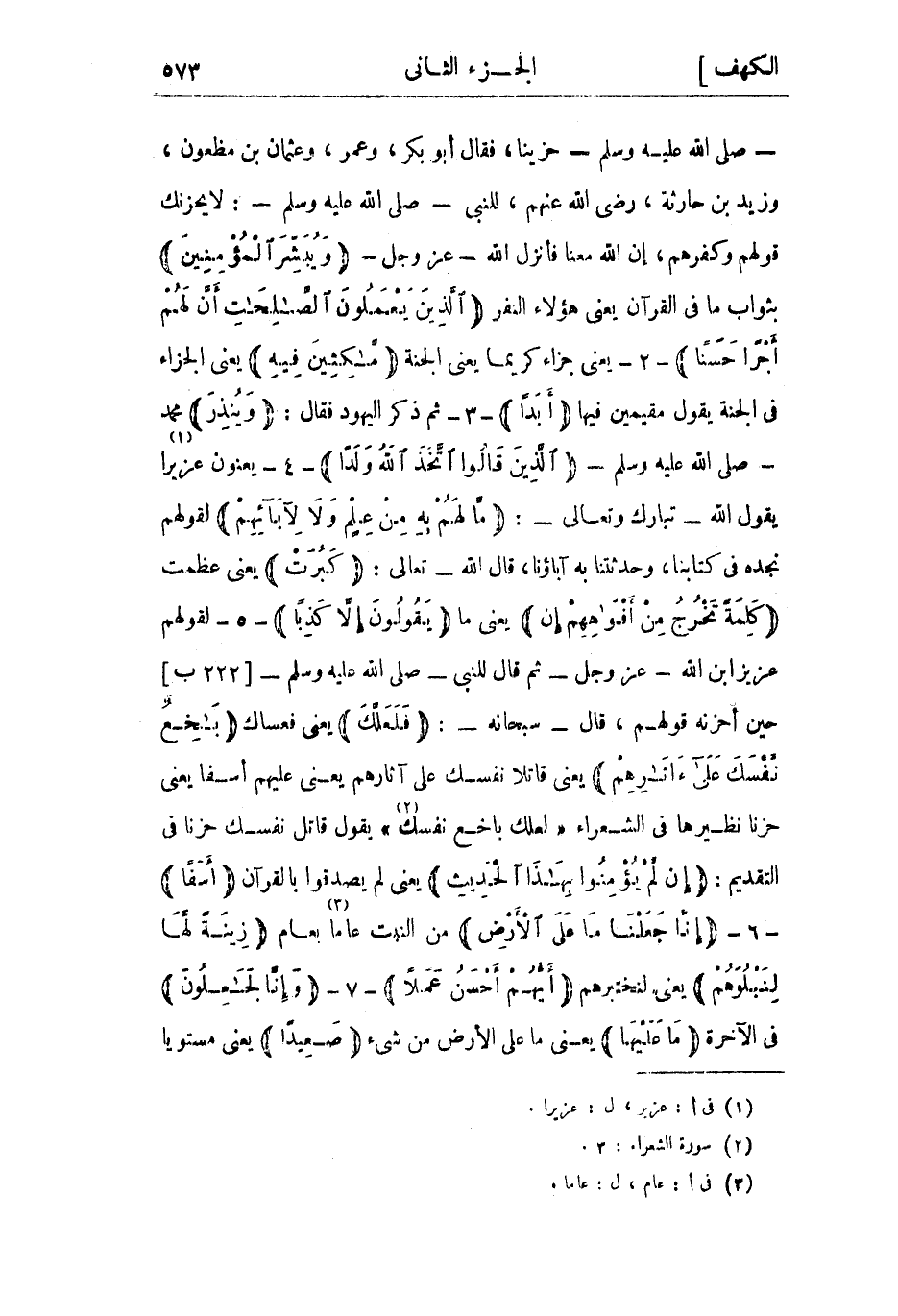 - صلى الله عليه وسلم- حزينا، فقال أبو بكر، وعمر، وعثمان بن مظعون، وزيد بن حارثة، رضي الله عنهم، للنبي- صلى الله عليه وسلم-: لا يحزنك قولهم وكفرهم، إن الله معنا فأنزل الله- عز وجل- وَيُبَشِّرَ الْمُؤْمِنِينَ بثواب ما في القرآن يعني هؤلاء النفر الَّذِينَ يَعْمَلُونَ الصَّالِحاتِ أَنَّ لَهُمْ أَجْراً حَسَناً- 2- يعني جزاء كريما يعني الجنة ماكِثِينَ فِيهِ يعني الجزاء في الجنة يقول مقيمين فيها أَبَداً- 3- ثم ذكر اليهود فقال: وَيُنْذِرَ محمد- صلى الله عليه وسلم- الَّذِينَ قالُوا اتَّخَذَ اللَّهُ وَلَداً- 4- يعنون عزيرا «1» يقول الله- تبارك وتعالى-: مَا لَهُمْ بِهِ مِنْ عِلْمٍ وَلا لِآبائِهِمْ لقولهم نجده في كتابنا، وحدثتنا به آباؤنا، قال الله- تعالى: كَبُرَتْ يعني عظمت كَلِمَةً تَخْرُجُ مِنْ أَفْواهِهِمْ إِنْ يعنى ما يَقُولُونَ إِلَّا كَذِباً- 5- لقولهم عزيز ابن الله- عز وجل- ثم قال للنبي- صلى الله عليه وسلم-[222 ب] حين أحزنه قولهم، قال- سبحانه-: فَلَعَلَّكَ يعني فعساك باخِعٌ نَفْسَكَ عَلى آثارِهِمْ يعني قاتلا نفسك على آثارهم يعني عليهم أسفا يعنى حزنا نظيرها فى الشعراء فَلَعَلَّكَ باخِعٌ نَفْسَكَ «2» يقول قاتل نفسك حزنا في التقديم: إِنْ لَمْ يُؤْمِنُوا بِهذَا الْحَدِيثِ يعني لم يصدقوا بالقرآن أَسَفاً- 6- إِنَّا جَعَلْنا ما عَلَى الْأَرْضِ من النبت عاما «3» بعام زِينَةً لَها لِنَبْلُوَهُمْ يعني لنختبرهم أَيُّهُمْ أَحْسَنُ عَمَلًا- 7- وَإِنَّا لَجاعِلُونَ في الآخرة مَا عَلَيْها يعني ما على الأرض من شيء صَعِيداً يعنى مستويا