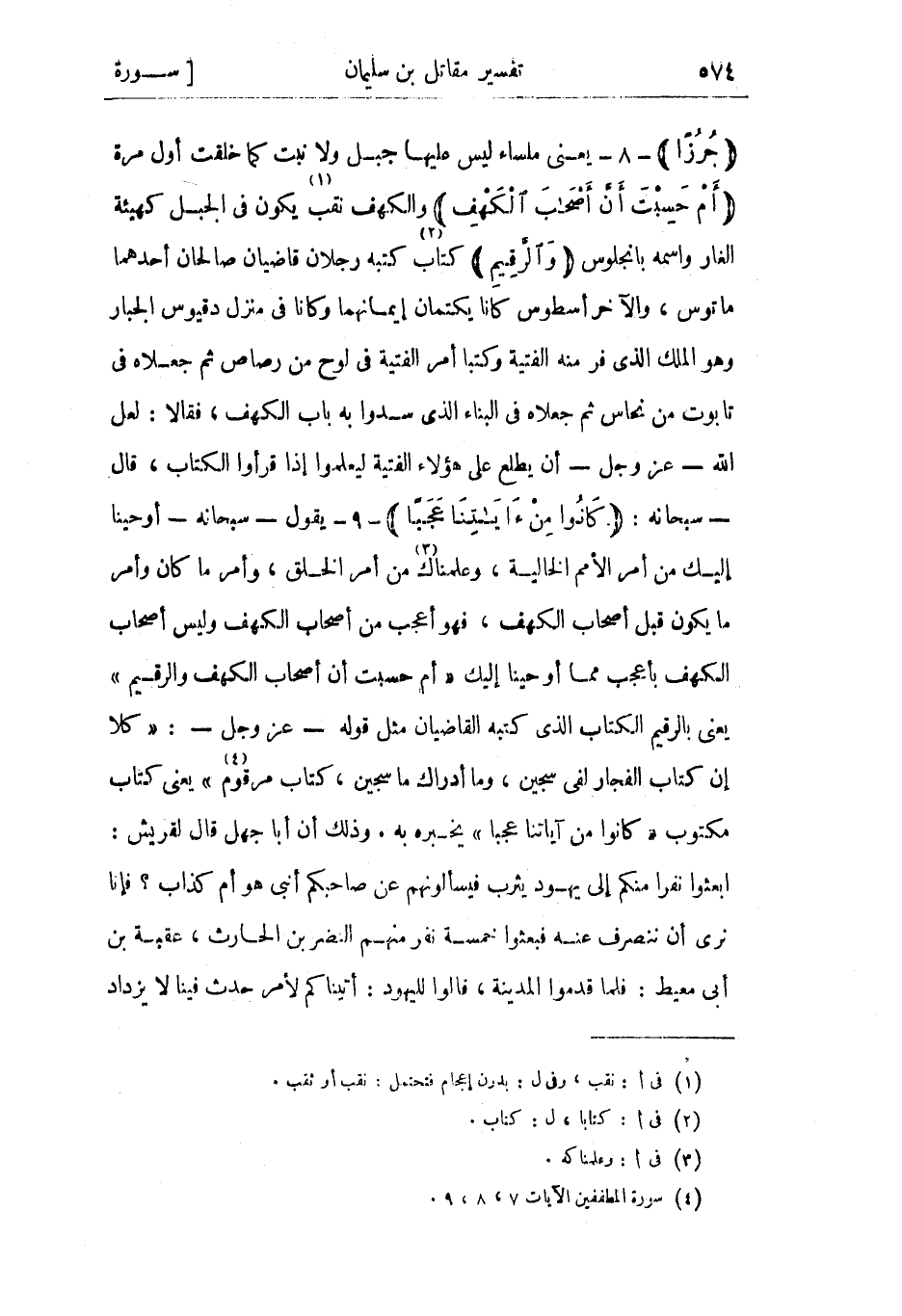 جُرُزاً- 8- يعني ملساء ليس عليها جبل ولا نبت كما خلقت أول مرة أَمْ حَسِبْتَ أَنَّ أَصْحابَ الْكَهْفِ والكهف نقب «1» يكون في الجبل كهيئة الغار واسمه بانجلوس وَالرَّقِيمِ «2» كتاب كتبه رجلان قاضيان صالحان أحدهما ماتوس، والآخر أسطوس كانا يكتمان إيمانهما وكانا في منزل دقيوس الجبار وهو الملك الذي فر منه الفتية وكتبا أمر الفتية في لوح من رصاص ثم جعلاه في تابوت من نحاس ثم جعلاه في البناء الذي سدوا به باب الكهف، فقالا: لعل الله- عز وجل- أن يطلع على هؤلاء الفتية ليعلموا إذا قرءوا الكتاب، قال- سبحانه: كانُوا مِنْ آياتِنا عَجَباً- 9- يقول- سبحانه- أوحينا إليك من أمر الأمم الخالية، وعلمناك «3» من أمر الخلق، وأمر ما كان وأمر ما يكون قبل أصحاب الكهف، فهو أعجب من أصحاب الكهف وليس أصحاب الكهف بأعجب مما أوحينا إليك «أَمْ حَسِبْتَ أَنَّ أَصْحابَ الْكَهْفِ وَالرَّقِيمِ» يعني بالرقيم الكتاب الذي كتبه القاضيان مثل قوله- عز وجل-: كَلَّا إِنَّ كِتابَ الفُجَّارِ لَفِي سِجِّينٍ، وَما أَدْراكَ مَا سِجِّينٌ، كِتابٌ مَرْقُومٌ «4» يعني كتاب مكتوب كانُوا مِنْ آياتِنا عَجَباً يخبره به. وذلك أن أبا جهل قال لقريش: