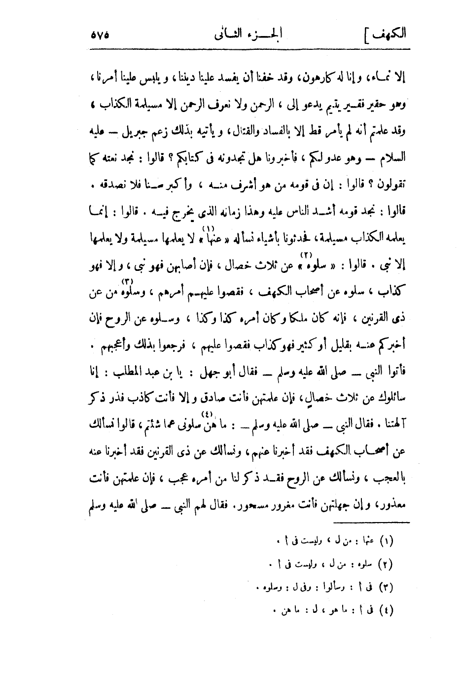 فأتوا النبي- صلى الله عليه وسلم- فقال أبو جهل: يا بن عبد المطلب: إنا سائلوك عن ثلاث خصال، فإن علمتهن فأنت صادق وإلا فأنت كاذب فذر ذكر آلهتنا. فَقَالَ النَّبِيُّ- صَلَّى اللَّهُ عَلَيْهِ وَسَلَّمَ-: مَا هن «4» سلوني عما شئتم، قالوا نسألك عن أصحاب الكهف فقد أخبرنا عنهم، ونسألك عن ذي القرنين فقد أخبرنا عنه بالعجب، ونسألك عن الروح فقد ذكر لنا من أمره عجب، فإن علمتهن فأنت معذور، وإن جهلتهن فأنت مغرور مسحور. فقال لهم النبي- صلى الله عليه وسلم