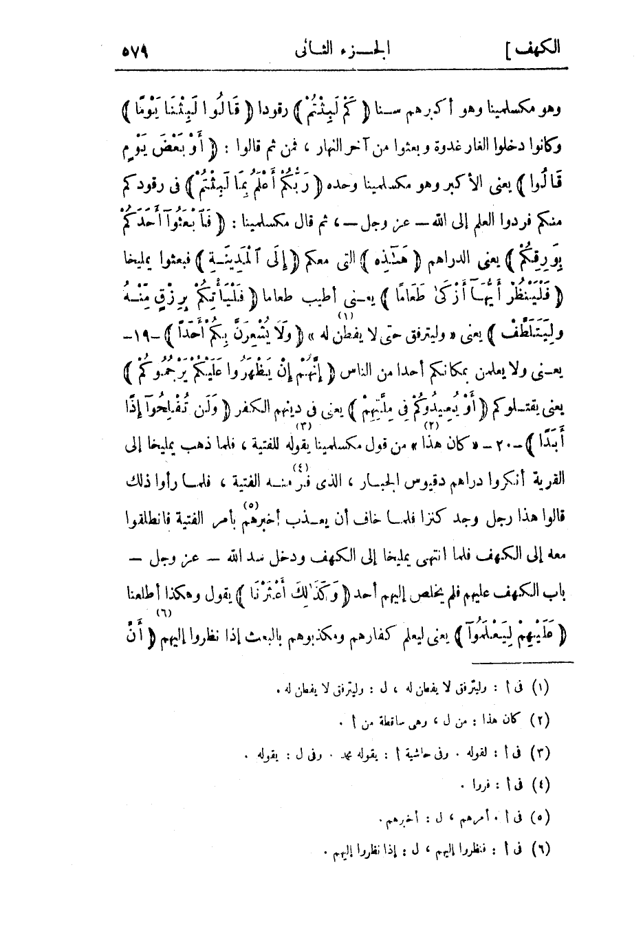 وهو مكسلمينا وهو أكبرهم سنا كَمْ لَبِثْتُمْ رقودا قالُوا لَبِثْنا يَوْماً وكانوا دخلوا الغار غدوة وبعثوا من آخر النهار، فمن ثم قالوا: أَوْ بَعْضَ يَوْمٍ قالُوا يعني الأكبر وهو مكسلمينا وحده رَبُّكُمْ أَعْلَمُ بِما لَبِثْتُمْ في رقودكم منكم فردوا العلم إلى الله- عز وجل-، ثم قال مكسلمينا: فَابْعَثُوا أَحَدَكُمْ بِوَرِقِكُمْ يعني الدراهم هذِهِ التي معكم إِلَى الْمَدِينَةِ فبعثوا يمليخا فَلْيَنْظُرْ أَيُّها أَزْكى طَعاماً يعني أطيب طعاما فَلْيَأْتِكُمْ بِرِزْقٍ مِنْهُ وَلْيَتَلَطَّفْ يعني «وليترفق حتى لا يفطن «1» له» وَلا يُشْعِرَنَّ بِكُمْ أَحَداً- 19- يعني ولا يعلمن بمكانكم أحدا من الناس إِنَّهُمْ إِنْ يَظْهَرُوا عَلَيْكُمْ يَرْجُمُوكُمْ يعنى يقتلوكم أَوْ يُعِيدُوكُمْ فِي مِلَّتِهِمْ يعني في دينهم الكفر وَلَنْ تُفْلِحُوا إِذاً أَبَداً- 20- «كان هذا» «2» من قول مكسلمينا يقوله «3» للفتية، فلما ذهب يمليخا إلى القرية أنكروا دراهم دقيوس الجبار، الذي فر «4» منه الفتية، فلما رأوا ذلك قالوا هذا رجل وجد كنزا فلما خاف أن يعذب أخبرهم «5» بأمر الفتية فانطلقوا معه إلى الكهف فلما انتهى يمليخا إلى الكهف ودخل سد الله- عز وجل- باب الكهف عليهم فلم يخلص إليهم أحد وَكَذلِكَ أَعْثَرْنا يقول وهكذا أطلعنا عَلَيْهِمْ لِيَعْلَمُوا يعني ليعلم كفارهم ومكذبوهم بالبعث إذا نظروا إليهم «6»