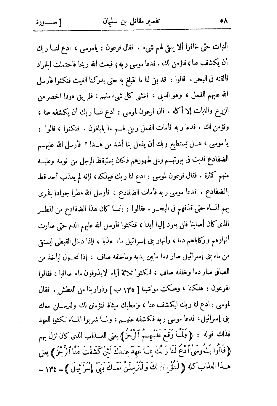 يا مُوسَى، هَلْ يستطيع ربك أن يفعل بنا أشد من هَذَا؟ فأرسل اللَّه عليهم الضفادع فدبت فِي بيوتهم وعلى ظهورهم فكان يستيقظ الرَّجُل من نومه وعليه منهم كثرة. فَقَالَ فرعون لموسى: ادع لنا ربك فيهلكه، فَإنَّهُ لَمْ يعذب أحد قطّ بالضفادع. فدعا مُوسَى ربه فأمات الضفادع، فأرسل اللَّه مطرا جوادا فجرى بهم الماء حَتَّى قذفهم فِي البحر. فقالوا: إِنَّمَا كان هَذَا الضفادع من المطر الَّذِي كان أصابنا فلن يعود إلينا أبدا، فنكثوا فأرسل اللَّه عليهم الدم حَتَّى صارت أنهارهم وركاباهم دما، وأنهار بني إِسْرَائِيل ماء عذبا، فإذا دخل القبطي ليستقي من ماء بني إِسْرَائِيل صار دما ما بين يديه وما خلفه صاف، إذا تحول ليأخذ من الصافي صار دما وخلفه صاف، فمكثوا ثلاثة أيام لا يذوقون ماء صافيا، فقالوا لفرعون: هلكنا، وهلكت مواشينا [135 ب] وذرارينا من العطش. فَقَالَ لموسى: ادع لنا ربك ليكشف عنا، ونعطيك ميثاقا لنؤمنن لك ولنرسلن معك بني إِسْرَائِيل، فدعا مُوسَى ربه فكشفه عَنْهُمْ، ولما شربوا الماء نكثوا العهد فذلك قوله: وَلَمَّا وَقَعَ عَلَيْهِمُ الرِّجْزُ يعني العذاب الَّذِي كان نزل بهم قالُوا يَا مُوسَى ادْعُ لَنا رَبَّكَ بِما عَهِدَ عِنْدَكَ لَئِنْ كَشَفْتَ عَنَّا الرِّجْزَ يعني هَذَا العذاب كله لَنُؤْمِنَنَّ لَكَ وَلَنُرْسِلَنَّ مَعَكَ بَنِي إِسْرائِيلَ- 134-