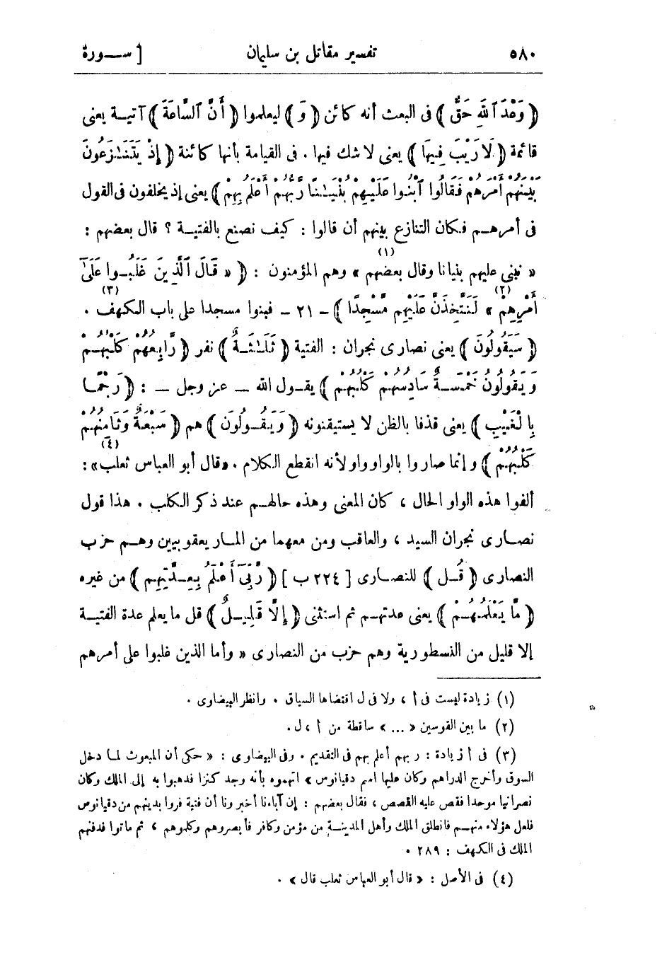 ألفوا هذه الواو الحال، كان المعنى وهذه حالهم عند ذكر الكلب. هذا قول نصارى نجران السيد، والعاقب ومن معهما من المار يعقوبيين وهم حزب النصارى قُلْ للنصارى [224 ب] رَبِّي أَعْلَمُ بِعِدَّتِهِمْ من غيره مَا يَعْلَمُهُمْ يعني عدتهم ثم استثنى إِلَّا قَلِيلٌ قل ما يعلم عدة الفتية إلا قليل من النسطورية وهم حزب من النصارى «وأما الذين غلبوا على أمرهم