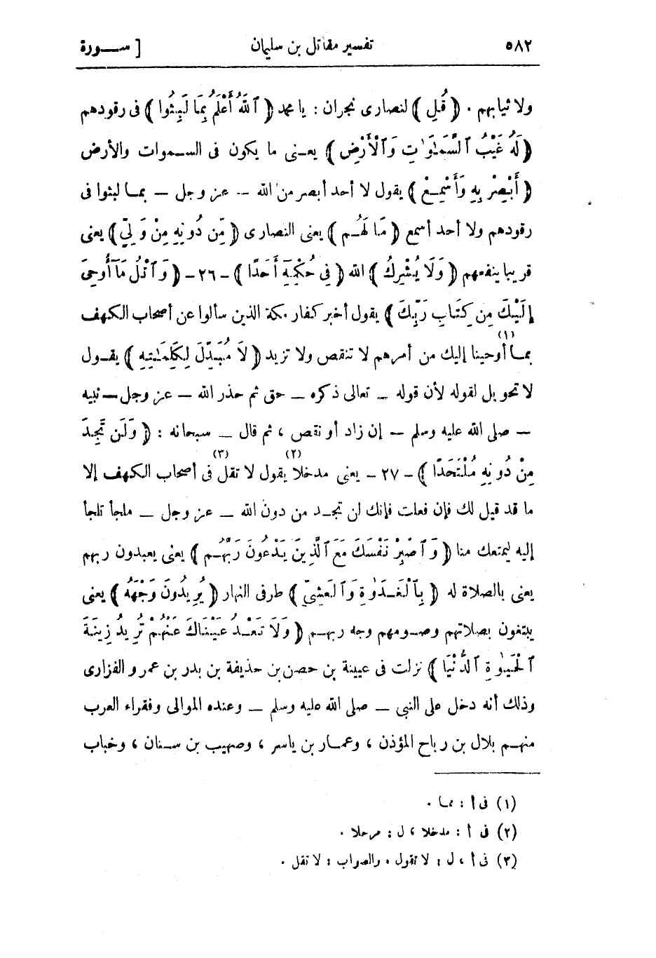 يقول أخبر كفار مكة الذين سألوا عن أصحاب الكهف بما «1» أوحينا إليك من أمرهم لا تنقص ولا تزيد لا مُبَدِّلَ لِكَلِماتِهِ يقول لا تحويل لقوله لأن قوله- تعالى ذكره- حق ثم حذر الله- عز وجل- نبيه- صلى الله عليه وسلم- إن زاد أو نقص، ثم قال- سبحانه: وَلَنْ تَجِدَ مِنْ دُونِهِ مُلْتَحَداً- 27- يعني مدخلا «2» يقول لا تقل «3» في أصحاب الكهف إلا ما قد قيل لك فإن فعلت فإنك لن تجد من دون الله- عز وجل- ملجأ تلجأ إليه ليمتعك منا وَاصْبِرْ نَفْسَكَ مَعَ الَّذِينَ يَدْعُونَ رَبَّهُمْ يعني يعبدون ربهم يعني بالصلاة له بِالْغَداةِ وَالْعَشِيِّ طرفي النهار يُرِيدُونَ وَجْهَهُ يعني يبتغون بصلاتهم وصومهم وجه ربهم وَلا تَعْدُ عَيْناكَ عَنْهُمْ تُرِيدُ زِينَةَ الْحَياةِ الدُّنْيا نزلت فى عيينة بن حصن بن حذيفة بن بدر بن عمرو الفزاري وذلك أنه دخل على النبي- صلى الله عليه وسلم- وعنده الموالي وفقراء العرب منهم بلال بن رباح المؤذن، وعمار بن ياسر، وصهيب بن سنان، وخباب
