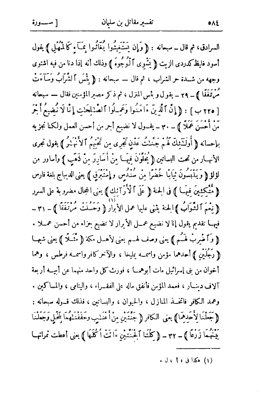 السرادق، ثم قال- سبحانه: وَإِنْ يَسْتَغِيثُوا يُغاثُوا بِماءٍ كَالْمُهْلِ يقول أسود غليظ كدردي الزيت يَشْوِي الْوُجُوهَ وذلك أنه إذا دنا من فيه اشتوى وجهه من شدة حر الشراب، ثم قال- سبحانه: بِئْسَ الشَّرابُ وَساءَتْ مُرْتَفَقاً- 29- يقول وبئس المنزل، ثم ذكر مصير المؤمنين فقال- سبحانه [225 ب] : إِنَّ الَّذِينَ آمَنُوا وَعَمِلُوا الصَّالِحاتِ إِنَّا لا نُضِيعُ أَجْرَ مَنْ أَحْسَنَ عَمَلًا- 30- يقول لا نضيع أجر من أحسن العمل ولكنا نجزيه بإحسانه أُولئِكَ لَهُمْ جَنَّاتُ عَدْنٍ تَجْرِي مِنْ تَحْتِهِمُ الْأَنْهارُ يقول تجري الأنهار من تحت البساتين يُحَلَّوْنَ فِيها مِنْ أَساوِرَ مِنْ ذَهَبٍ وأساور من لؤلؤ وَيَلْبَسُونَ ثِياباً خُضْراً مِنْ سُنْدُسٍ وَإِسْتَبْرَقٍ يعني الديباج بلغة فارس مُتَّكِئِينَ فِيها في الجنة عَلَى الْأَرائِكِ يعني الحجال مضروبة على السرر نِعْمَ الثَّوابُ الجنة يثني عليها عمل الأبرار «1» وَحَسُنَتْ مُرْتَفَقاً- 31- فيها تقديم يقول إنا لا نضيع عمل الأبرار لا تضيع جزاء من أحسن عملا.