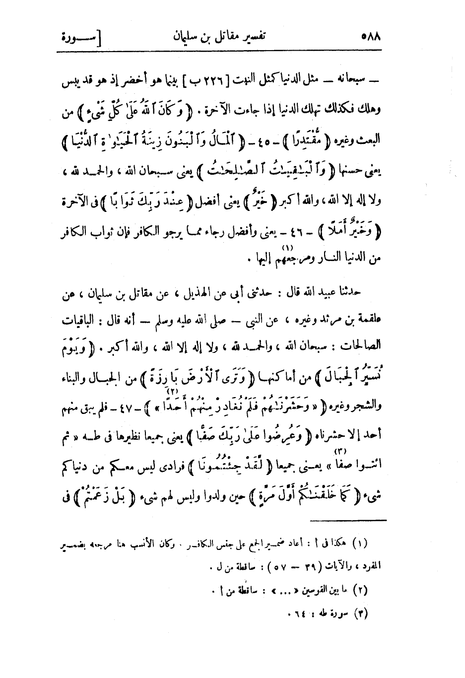 حَدَّثَنَا عُبَيْدُ اللَّهِ قَالَ: حَدَّثَنِي أَبِي عَنِ الْهُذَيْلِ، عَنْ مقاتل بْنِ سُلَيْمَانَ، عَنْ عَلْقَمَةَ بْنِ مَرْثَدٍ وَغَيْرِهِ، عن النبي- صلى الله عليه وسلم- أنه قَالَ: الْبَاقِيَاتُ الصَّالِحَاتُ: سُبْحَانَ اللَّهِ، وَالْحَمْدُ للَّهِ، وَلا إِلَهَ إِلا اللَّهُ، وَاللَّهُ أَكْبَرُ.