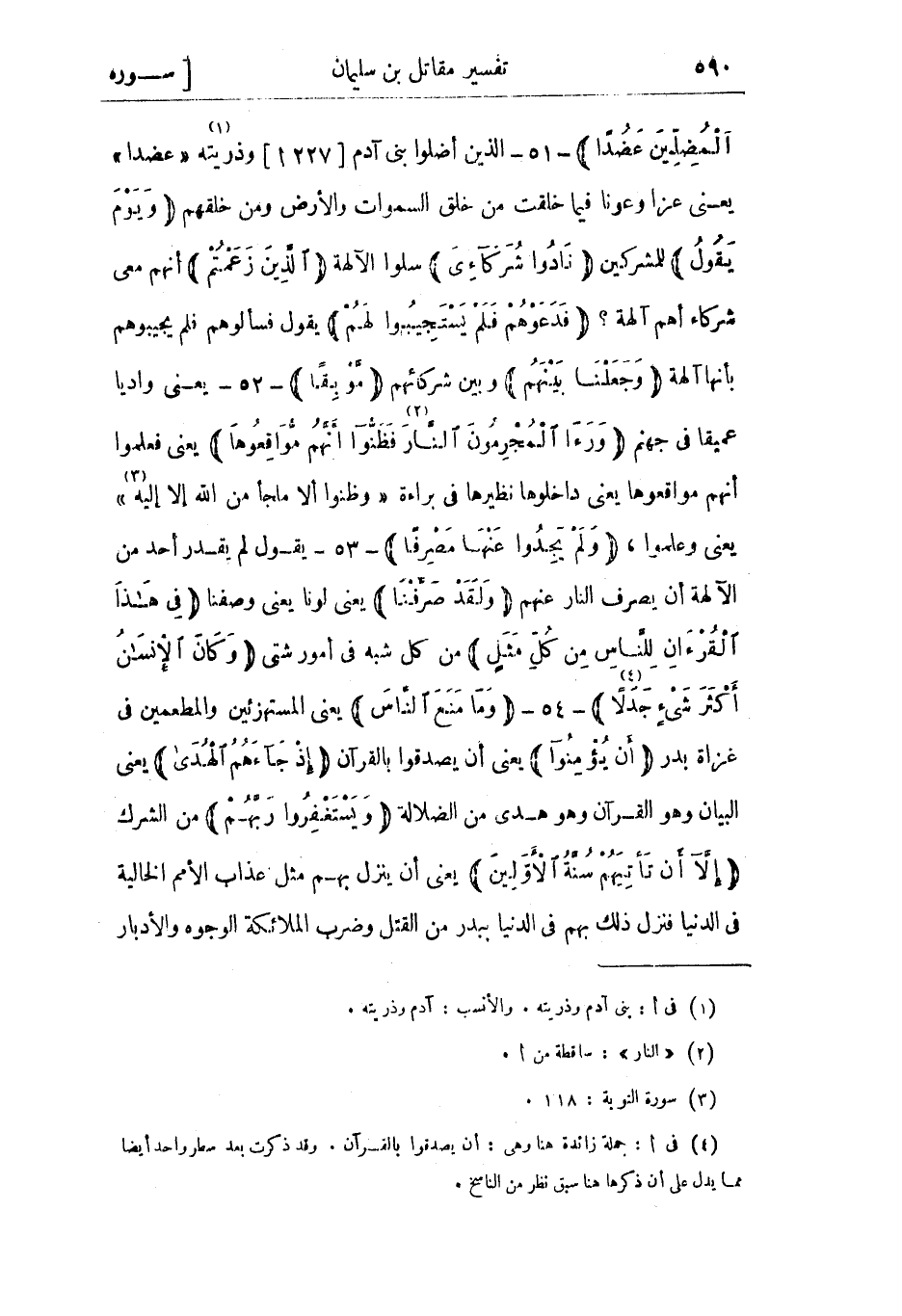 الذين أضلوا بنى آدم [227 ا] وذريته «1» «عَضُدًا» يعني عزا وعونا فيما خلقت من خلق السموات والأرض ومن خلقهم وَيَوْمَ يَقُولُ للمشركين نادُوا شُرَكائِيَ سلوا الآلهة الَّذِينَ زَعَمْتُمْ أنهم معي شركاء أهم آلهة؟ فَدَعَوْهُمْ فَلَمْ يَسْتَجِيبُوا لَهُمْ يقول فسألوهم فلم يجيبوهم بأنها آلهة وَجَعَلْنا بَيْنَهُمْ وبين شركائهم مَوْبِقاً- 52- يعني واديا عميقا في جهنم وَرَأَى الْمُجْرِمُونَ النَّارَ «2» فَظَنُّوا أَنَّهُمْ مُواقِعُوها يعني فعلموا أنهم مواقعوها يعني داخلوها نظيرها في براءة وَظَنُّوا أَنْ لا مَلْجَأَ مِنَ اللَّهِ إِلَّا إِلَيْهِ «3» يعنى وعلموا، وَلَمْ يَجِدُوا عَنْها مَصْرِفاً- 53- يقول لم يقدر أحد من الآلهة أن يصرف النار عنهم وَلَقَدْ صَرَّفْنا يعني لونا يعني وصفنا فِي هذَا الْقُرْآنِ لِلنَّاسِ مِنْ كُلِّ مَثَلٍ من كل شبه في أمور شتى وَكانَ الْإِنْسانُ أَكْثَرَ شَيْءٍ جَدَلًا «4» - 54- وَما مَنَعَ النَّاسَ يعني المستهزئين والمطعمين في غزاة بدر أَنْ يُؤْمِنُوا يعني أن يصدقوا بالقرآن إِذْ جاءَهُمُ الْهُدى يعني البيان وهو القرآن وهو هدى من الضلالة وَيَسْتَغْفِرُوا رَبَّهُمْ من الشرك إِلَّا أَنْ تَأْتِيَهُمْ سُنَّةُ الْأَوَّلِينَ يعني أن ينزل بهم مثل عذاب الأمم الخالية في الدنيا فنزل ذلك بهم في الدنيا ببدر من القتل وضرب الملائكة الوجوه والأدبار