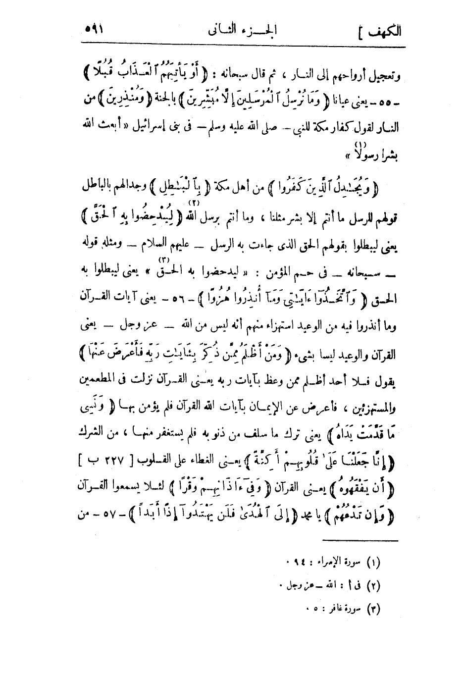 وتعجيل أرواحهم إلى النار، ثم قال سبحانه: أَوْ يَأْتِيَهُمُ الْعَذابُ قُبُلًا- 55- يعني عيانا وَما نُرْسِلُ الْمُرْسَلِينَ إِلَّا مُبَشِّرِينَ بالجنة وَمُنْذِرِينَ من النار لقول كفار مكة للنبي- صلى الله عليه وسلم- في بني إسرائيل أَبَعَثَ اللَّهُ بَشَراً رَسُولًا «1» وَيُجادِلُ الَّذِينَ كَفَرُوا من أهل مكة بِالْباطِلِ وجدالهم بالباطل قولهم للرسل مَا أَنْتُمْ إِلا بَشَرٌ مِثْلُنَا، وَمَا أنتم برسل الله «2» لِيُدْحِضُوا بِهِ الْحَقَّ يعني ليبطلوا بقولهم الحق الذي جاءت به الرسل- عليهم السلام- ومثله قوله- سبحانه- فى حم المؤمن: لِيُدْحِضُوا بِهِ الْحَقَّ «3» يعني ليبطلوا به الحق وَاتَّخَذُوا آياتِي وَما أُنْذِرُوا هُزُواً- 56- يعني آيات القرآن وما أنذروا فيه من الوعيد استهزاء منهم أنه ليس من الله- عز وجل- يعني القرآن والوعيد ليسا بشيء وَمَنْ أَظْلَمُ مِمَّنْ ذُكِّرَ بِآياتِ رَبِّهِ فَأَعْرَضَ عَنْها يقول فلا أحد أظلم ممن وعظ بآيات ربه يعني القرآن نزلت في المطعمين والمستهزئين، فأعرض عن الإيمان بآيات الله القرآن فلم يؤمن بها وَنَسِيَ ما قَدَّمَتْ يَداهُ يعني ترك ما سلف من ذنوبه فلم يستغفر منها، من الشرك إِنَّا جَعَلْنا عَلى قُلُوبِهِمْ أَكِنَّةً يعنى الغطاء على القلوب [227 ب] أَنْ يَفْقَهُوهُ يعني القرآن وَفِي آذانِهِمْ وَقْراً لئلا يسمعوا القرآن وَإِنْ تَدْعُهُمْ يا محمد إِلَى الْهُدى فَلَنْ يَهْتَدُوا إِذاً أَبَداً- 57- من