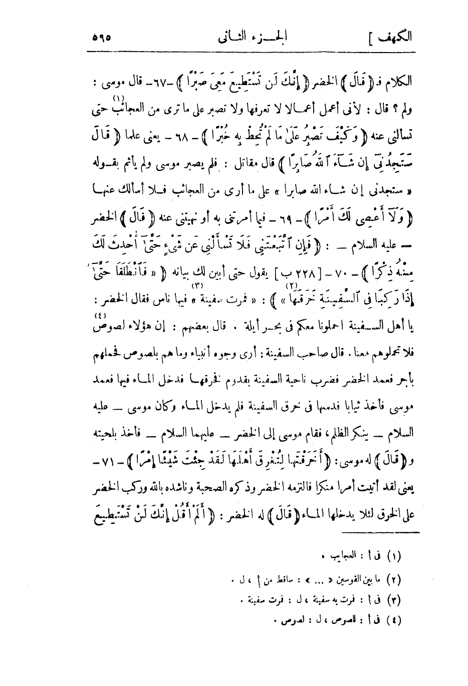 ولم؟ قال: لأني أعمل أعمالا لا تعرفها ولا تصبر على ما ترى من العجائب «1» حتى تسألني عنه وَكَيْفَ تَصْبِرُ عَلى مَا لَمْ تُحِطْ بِهِ خُبْراً- 68- يعني علما قالَ سَتَجِدُنِي إِنْ شاءَ اللَّهُ صابِراً قال مُقَاتِلُ: فلم يصبر موسى ولم يأثم بقوله سَتَجِدُنِي إِنْ شاءَ اللَّهُ صابِراً على ما أرى من العجائب فلا أسألك عنها وَلا أَعْصِي لَكَ أَمْراً- 69- فيما أمرتني به أو نهيتني عنه قالَ الخضر- عليه السلام-: فَإِنِ اتَّبَعْتَنِي فَلا تَسْئَلْنِي عَنْ شَيْءٍ حَتَّى أُحْدِثَ لَكَ مِنْهُ ذِكْراً- 70-[228 ب] يقول حتى أبين لك بيانه «فَانْطَلَقا حَتَّى إِذا رَكِبا فِي السَّفِينَةِ خَرَقَها» «2» : «فمرت سفينة» «3» فيها ناس فقال الخضر: