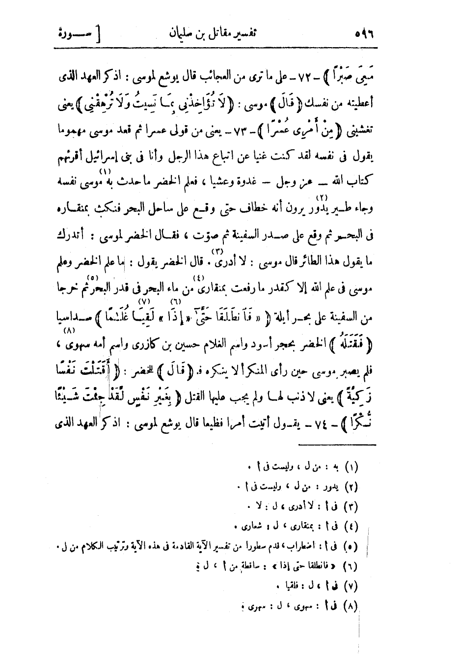 على ما ترى من العجائب قال يوشع لموسى: اذكر العهد الذي أعطيته من نفسك قالَ موسى: لا تُؤاخِذْنِي بِما نَسِيتُ وَلا تُرْهِقْنِي يعنى تغشينى مِنْ أَمْرِي عُسْراً- 73- يعني من قولي عسرا ثم قعد موسى مهموما يقول في نفسه لقد كنت غنيا عن اتباع هذا الرجل وأنا في بني إسرائيل أقرئهم كتاب الله- عز وجل- غدوة وعشيا، فعلم الخضر ما حدث به «1» موسى نفسه وجاء طير يدور «2» يرون أنه خطاف حتى وقع على ساحل البحر فنكث بمنقاره في البحر ثم وقع على صدر السفينة ثم صوت، فقال الخضر لموسى: أتدرك ما يقول هذا الطائر قال موسى: لا أدري «3» . قال الخضر يقول: ما علم الخضر وعلم موسى في علم الله إلا كقدر ما رفعت بمنقاري «4» من ماء البحر في قدر البحر «5» ثم خرجا من السفينة على بحر أيلة «فَانْطَلَقا حَتَّى «إِذا» «6» لَقِيا «7» غُلاماً سداسيا فَقَتَلَهُ الخضر بحجر أسود واسم الغلام حسين بن كازري واسم أمه سهوى «8» ، فلم يصبر موسى حين رأى المنكر ألا ينكره ف قالَ للخضر: أَقَتَلْتَ نَفْساً زَكِيَّةً يعني لا ذنب لها ولم يجب عليها القتل بِغَيْرِ نَفْسٍ لَقَدْ جِئْتَ شَيْئاً نُكْراً- 74- يقول أتيت أمرا فظيعا قال يوشع لموسى: اذكر العهد الذي