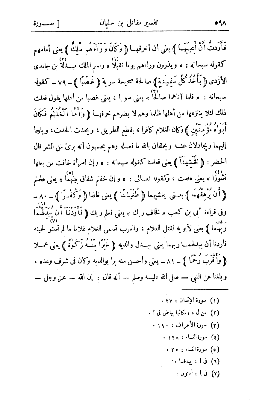 يعنى أن أخرقها وَكانَ وَراءَهُمْ مَلِكٌ يعني أمامهم كقوله سبحانه: وَيَذَرُونَ وَراءَهُمْ يَوْماً ثَقِيلًا «1» واسم الملك مبدلة «2» بن جلندي الأزدي يَأْخُذُ كُلَّ سَفِينَةٍ صالحة صحيحة سوية غَصْباً- 79- كقوله سبحانه: فَلَمَّا آتاهُما صالِحاً «3» يعني سويا، يعني غصبا من أهلها يقول فعلت ذلك لئلا ينتزعها من أهلها ظلما وهم لا يضرهم خرقها وَأَمَّا الْغُلامُ فَكانَ أَبَواهُ مُؤْمِنَيْنِ
