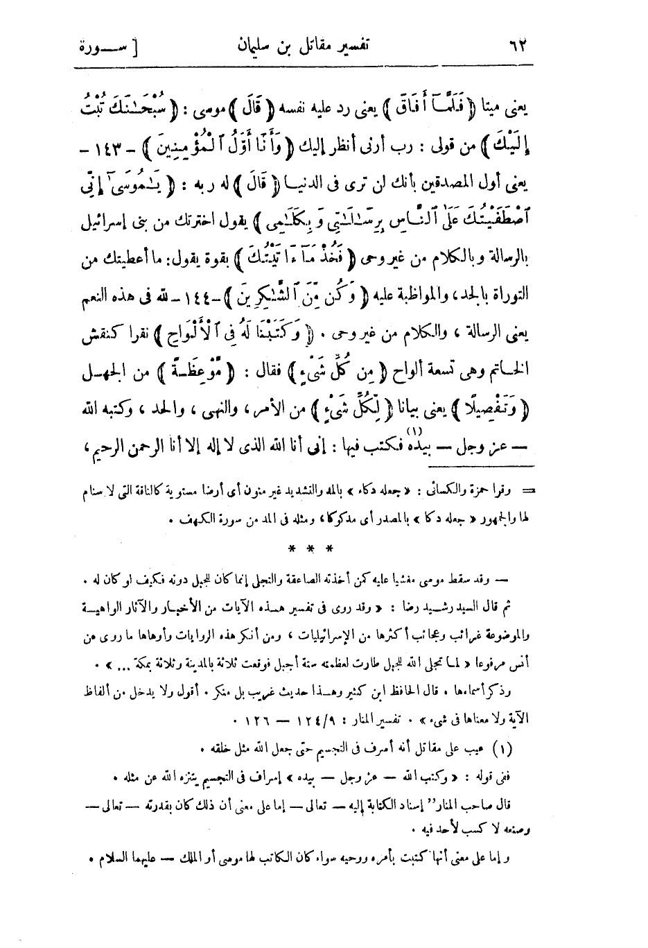 يعني ميتا فَلَمَّا أَفاقَ يعني رد عَلَيْه نفسه قالَ موسى: سُبْحانَكَ تُبْتُ إِلَيْكَ من قولي: رب أرنى أنظر إليك وَأَنَا أَوَّلُ الْمُؤْمِنِينَ- 143- يعني أول المصدقين بأنك لن تُرى فِي الدُّنْيَا قالَ لَهُ ربه: يَا مُوسى إِنِّي اصْطَفَيْتُكَ عَلَى النَّاسِ بِرِسالاتِي وَبِكَلامِي يَقُولُ اخترتك من بني إِسْرَائِيل بالرسالة وبالكلام من غير وحى فَخُذْ ما آتَيْتُكَ بقوة يَقُولُ: ما أعطيتك من التوراة بالجد، والمواظبة عليه وَكُنْ مِنَ الشَّاكِرِينَ- 144- للَّه فِي هَذِهِ النعم يعني الرسالة، والكلام من غَيْر وحي. وَكَتَبْنا لَهُ فِي الْأَلْواحِ نقرا كنقش الخاتم وهي تسعة ألواح مِنْ كُلِّ شَيْءٍ فَقَالَ: مَوْعِظَةً من الجهل وَتَفْصِيلًا يعني بيانا لِكُلِّ شَيْءٍ من الأمر، والنهي، والحد، وكتبه اللَّه- عَزَّ وَجَلّ- بيده «1» فكتب فيها: إني أَنَا اللَّه الَّذِي لا إله إِلَّا أَنَا الرحمن الرحيم،