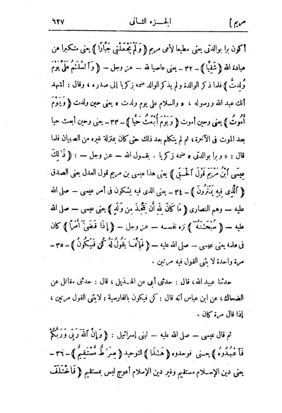 أكون برا بوالدتي يعني مطيعا لأمي مريم وَلَمْ يَجْعَلْنِي جَبَّاراً يعني متكبرا عن عبادة الله شَقِيًّا- 32- يعني عاصيا لله- عز وجل- وَالسَّلامُ عَلَيَّ يَوْمَ وُلِدْتُ فلما ذكر الوالدة ولم يذكر الوالد ضمه زكريا إلى صدره، وقال: أشهد أنك عبد الله ورسوله، «وَالسَّلامُ عَلَيَّ يَوْمَ وُلِدْتُ» يعني حين ولدت وَيَوْمَ أَمُوتُ يعني وحين أموت وَيَوْمَ أُبْعَثُ حَيًّا- 33- يعني وحين أبعث حيا بعد الموت في الآخرة، ثم لم يتكلم بعد ذلك حتى كان بمنزلة غيره من الصبيان فلما قال: «وَبَرًّا بِوالِدَتِي» ضمه زكريا. يقول الله- عز وجل-: ذلِكَ عِيسَى ابْنُ مَرْيَمَ قَوْلَ الْحَقِّ يعنى هذا عيسى بن مريم قول العدل يعني الصدق الَّذِي فِيهِ يَمْتَرُونَ- 34- يعني الذي فيه يشكون في أمر عيسى- صلى الله عليه- وهم النصارى مَا كانَ لِلَّهِ أَنْ يَتَّخِذَ مِنْ وَلَدٍ يعنى عيسى- صلى الله عليه- سُبْحانَهُ نزه نفسه- عز وجل- إِذا قَضى أَمْراً كان في علمه يعني عيسى- صلى الله عليه- فَإِنَّما يَقُولُ لَهُ كُنْ فَيَكُونُ- 35- مرة واحدة لا يثني القول فيه مرتين.