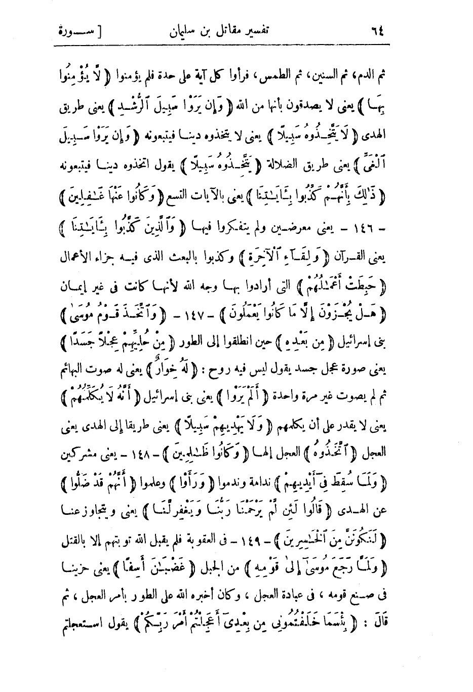 ثُمّ الدم، ثُمّ السنين، ثُمّ الطمس، فرأوا كُلّ آية عَلَى حدة فلم يؤمنوا لا يُؤْمِنُوا بِها يعني لا يصدقون بأنها من اللَّه وَإِنْ يَرَوْا سَبِيلَ الرُّشْدِ يعنى طريق الهدى لا يَتَّخِذُوهُ سَبِيلًا يعني لا يتخذوه دينا فيتبعونه وَإِنْ يَرَوْا سَبِيلَ الغَيِّ يعني طريق الضلالة يَتَّخِذُوهُ سَبِيلًا يَقُولُ اتخذوه دينا فيتبعونه ذلِكَ بِأَنَّهُمْ كَذَّبُوا بِآياتِنا يعنى بالآيات التسع وَكانُوا عَنْها غافِلِينَ- 146- يعني معرضين وَلَم يتفكروا فيها وَالَّذِينَ كَذَّبُوا بِآياتِنا يعني القرآن وَلِقاءِ الْآخِرَةِ وكذبوا بالبعث الَّذِي فِيهِ جزاء الأعمال حَبِطَتْ أَعْمالُهُمْ التي أرادوا بها وجه اللَّه لأنها كَانَتْ فِي غَيْر إيمان هَلْ يُجْزَوْنَ إِلَّا مَا كانُوا يَعْمَلُونَ- 147- وَاتَّخَذَ قَوْمُ مُوسى بني إِسْرَائِيل مِنْ بَعْدِهِ حين انطلقوا إلى الطور مِنْ حُلِيِّهِمْ عِجْلًا جَسَداً يعني صورة عجل جسد يَقُولُ لَيْسَ فِيهِ روح: لَهُ خُوارٌ يعني لَهُ صوت البهائم ثُمّ لَمْ يصوت غَيْر مرة واحدة أَلَمْ يَرَوْا يعني بني إِسْرَائِيل أَنَّهُ لا يُكَلِّمُهُمْ يعني لا يقدر عَلَى أن يكلمهم وَلا يَهْدِيهِمْ سَبِيلًا يعني طريقا إلى الهدى يعني العجل اتَّخَذُوهُ العجل إلها وَكانُوا ظالِمِينَ- 148- يعني مشركين وَلَمَّا سُقِطَ فِي أَيْدِيهِمْ ندامة وندموا وَرَأَوْا وعلموا أَنَّهُمْ قَدْ ضَلُّوا عن الهدى قالُوا لَئِنْ لَمْ يَرْحَمْنا رَبُّنا وَيَغْفِرْ لَنا يعنى ويتجاوز عنا لَنَكُونَنَّ مِنَ الْخاسِرِينَ- 149- فِي العقوبة فلم يقبل اللَّه توبتهم إِلَّا بالقتل وَلَمَّا رَجَعَ مُوسى إِلى قَوْمِهِ من الجبل غَضْبانَ أَسِفاً يعني حزينا فِي صنع قومه، فِي عبادة العجل، وكان أخبره اللَّه على الطور بأمر العجل، ثُمّ قَالَ: بِئْسَما خَلَفْتُمُونِي مِنْ بَعْدِي أَعَجِلْتُمْ أَمْرَ رَبِّكُمْ يقول استعجلتم