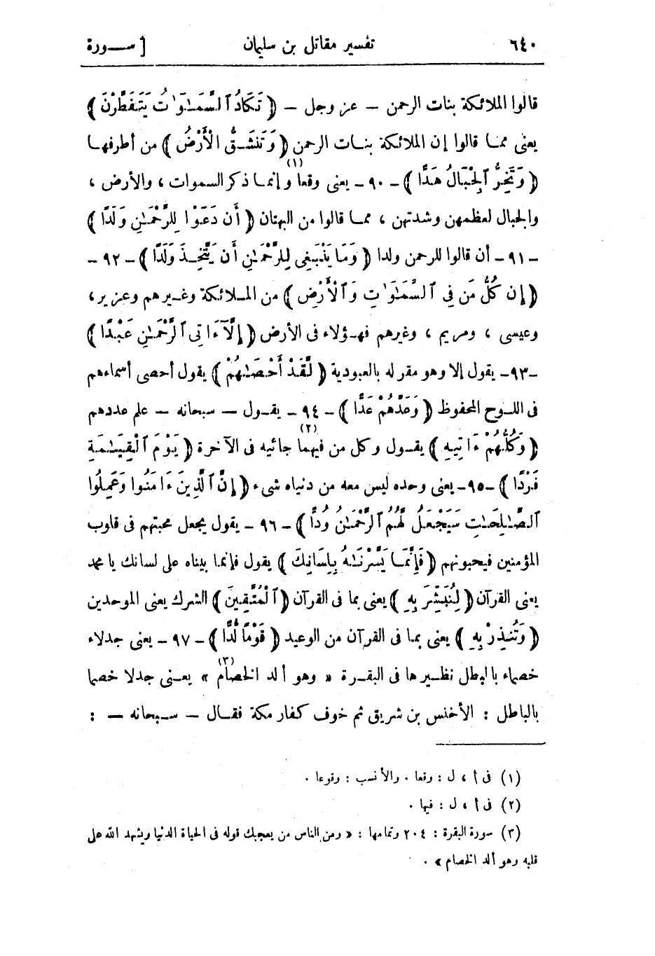 قالوا الملائكة بنات الرحمن- عز وجل- تَكادُ السَّماواتُ يَتَفَطَّرْنَ يعني مما قالوا أن الملائكة بنات الرحمن وَتَنْشَقُّ الْأَرْضُ من أطرفها وَتَخِرُّ الْجِبالُ هَدًّا- 90- يعني وقعا «1» وإنما ذكر السموات، والأرض، والجبال لعظمهن وشدتهن، مما قالوا من البهتان أَنْ دَعَوْا لِلرَّحْمنِ وَلَداً- 91- أن قالوا لِلرَّحْمَنِ وَلَدًا وَما يَنْبَغِي لِلرَّحْمنِ أَنْ يَتَّخِذَ وَلَداً- 92- إِنْ كُلُّ مَنْ فِي السَّماواتِ وَالْأَرْضِ من الملائكة وغيرهم وعزير، وعيسى، ومريم، وغيرهم فهؤلاء في الأرض إِلَّا آتِي الرَّحْمنِ عَبْداً- 93- يقول إلا وهو مقر له بالعبودية لَقَدْ أَحْصاهُمْ يقول أحصى أسماءهم في اللوح المحفوظ وَعَدَّهُمْ عَدًّا- 94- يقول- سبحانه- علم عددهم وَكُلُّهُمْ آتِيهِ يقول وكل من فيهما «2» جائيه في الآخرة يَوْمَ الْقِيامَةِ فَرْداً- 95- يعني وحده ليس معه من دنياه شيء إِنَّ الَّذِينَ آمَنُوا وَعَمِلُوا الصَّالِحاتِ سَيَجْعَلُ لَهُمُ الرَّحْمنُ وُدًّا- 96- يقول يجعل محبتهم في قلوب المؤمنين فيحبونهم فَإِنَّما يَسَّرْناهُ بِلِسانِكَ يقول فإنما بيناه على لسانك يا محمد يعني القرآن لِتُبَشِّرَ بِهِ يعني بما في القرآن الْمُتَّقِينَ الشرك يعني الموحدين وَتُنْذِرَ بِهِ يعني بما في القرآن من الوعيد قَوْماً لُدًّا- 97- يعنى جدلاء خصماء بالبطل نظيرها فى البقرة وَهُوَ أَلَدُّ الْخِصامِ «3» يعني جدلا خصما بالباطل: الأخنس بن شريق ثم خوف كفار مكة فقال- سبحانه-: