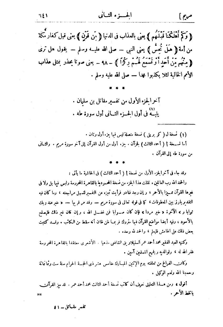 آخر الجزء الأول من تفسير مقاتل بن سليمان.