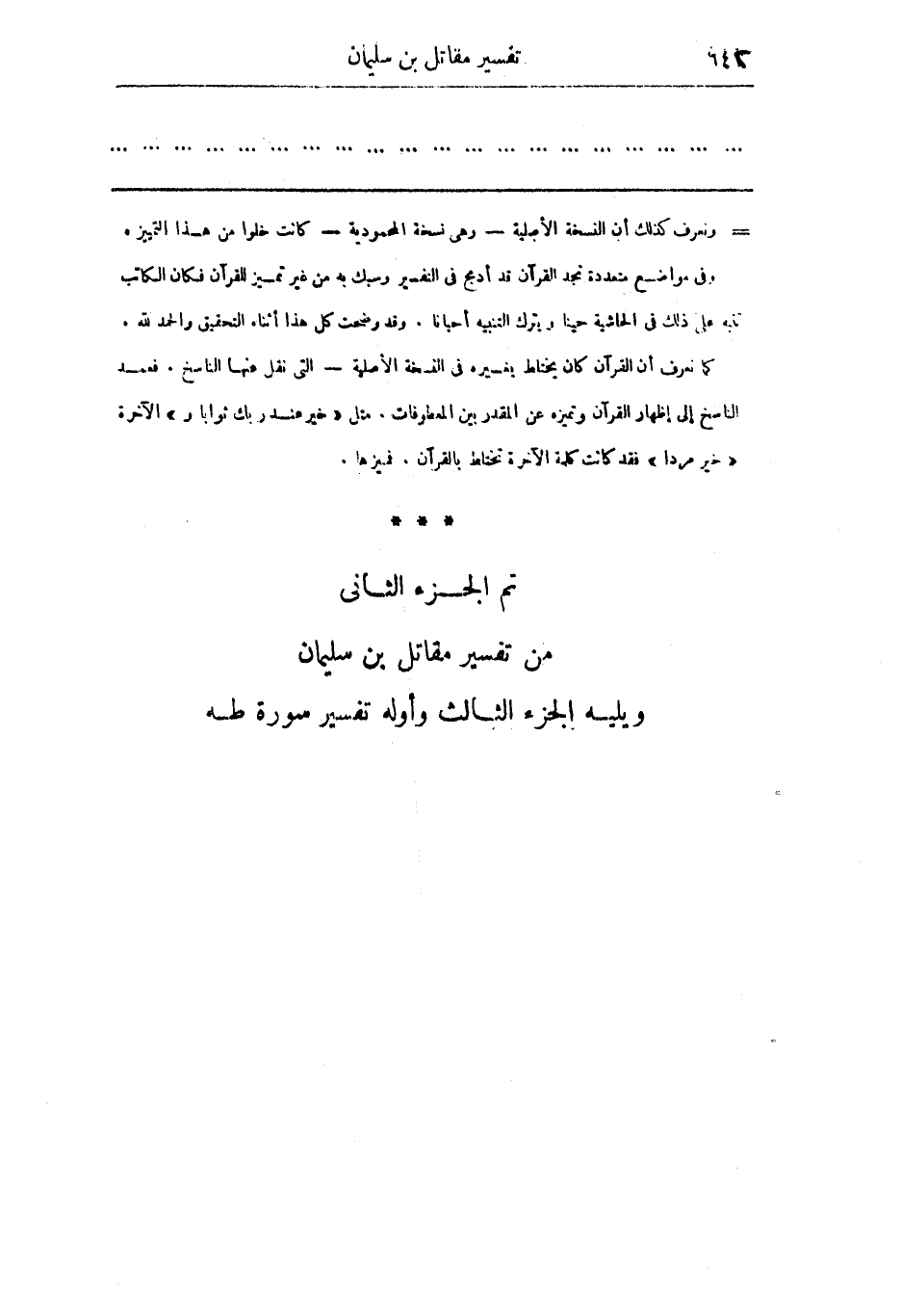 تم الجزء الثاني من تفسير مقاتل بن سليمان ويليه الجزء الثالث وأوله تفسير سورة طه