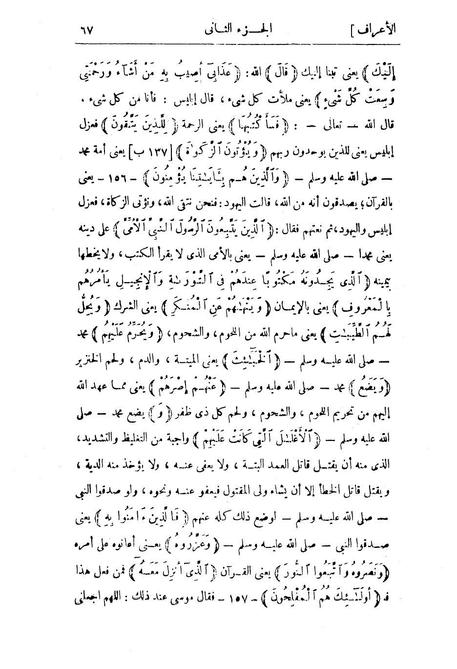 قَالَ اللَّه- تَعَالَى-: فَسَأَكْتُبُها يعني الرحمة لِلَّذِينَ يَتَّقُونَ فعزل إبليس يعني للذين يوحدون ربهم وَيُؤْتُونَ الزَّكاةَ [137 ب] يعني أمة محمد- صلى الله عليه وسلم- وَالَّذِينَ هُمْ بِآياتِنا يُؤْمِنُونَ- 156- يعني بالقرآن، يصدقون أَنَّهُ من اللَّه، قَالَت اليهود: فنحن نتقي اللَّه، ونؤتي الزكاة، فعزل إبليس واليهود، ثُمّ نعتهم فَقَالَ: الَّذِينَ يَتَّبِعُونَ الرَّسُولَ النَّبِيَّ الْأُمِّيَّ عَلَى دينه يعني محمدا- صَلَّى اللَّهُ عَلَيْهِ وَسَلَّمَ- يعني بالأمي الَّذِي لا يقرأ الكتب، وَلا يخطها بيمينه الَّذِي يَجِدُونَهُ مَكْتُوباً عِنْدَهُمْ فِي التَّوْراةِ وَالْإِنْجِيلِ يَأْمُرُهُمْ بِالْمَعْرُوفِ يعنى بالإيمان وَيَنْهاهُمْ عَنِ الْمُنْكَرِ يعنى الشرك وَيُحِلُّ لَهُمُ الطَّيِّباتِ يعني ما حرم اللَّه من اللحوم، والشحوم، وَيُحَرِّمُ عَلَيْهِمُ محمد- صَلَّى اللَّهُ عَلَيْهِ وَسَلَّمَ- الْخَبائِثَ يعني الميتة، والدم، ولحم الخنزير وَيَضَعُ محمد- صَلَّى اللَّهُ عَلَيْهِ وَسَلَّمَ- عَنْهُمْ إِصْرَهُمْ يعني مما عهد اللَّه إليهم من تحريم اللحوم، والشحوم، ولحم كُلّ ذِي ظفر وَيضع محمد- صلى الله عليه وسلم- الْأَغْلالَ الَّتِي كانَتْ عَلَيْهِمْ واجبة من التغليظ والتشديد، الَّذِي منه أن يقتل قاتل العمد البتة، وَلا يعفى عَنْهُ، وَلا يؤخذ منه الدية، ويقتل قاتل الخطأ إِلَّا أن يشاء وَلِي المقتول فيعفو عَنْهُ ونحوه، ولو صدقوا النَّبِيّ- صَلَّى اللَّهُ عَلَيْهِ وَسَلَّمَ- لوضع ذَلِكَ كله عَنْهُمْ فَالَّذِينَ آمَنُوا بِهِ يعني صدقوا النَّبِيّ- صَلَّى اللَّهُ عَلَيْهِ وَسَلَّمَ- وَعَزَّرُوهُ يعني أعانوه عَلَى أمره وَنَصَرُوهُ وَاتَّبَعُوا النُّورَ يعنى القرآن الَّذِي أُنْزِلَ مَعَهُ فَمنْ فعل هَذَا ف أُولئِكَ هُمُ الْمُفْلِحُونَ- 157- فَقَالَ مُوسَى عِنْد ذَلِكَ: اللَّهُمَّ اجعلني