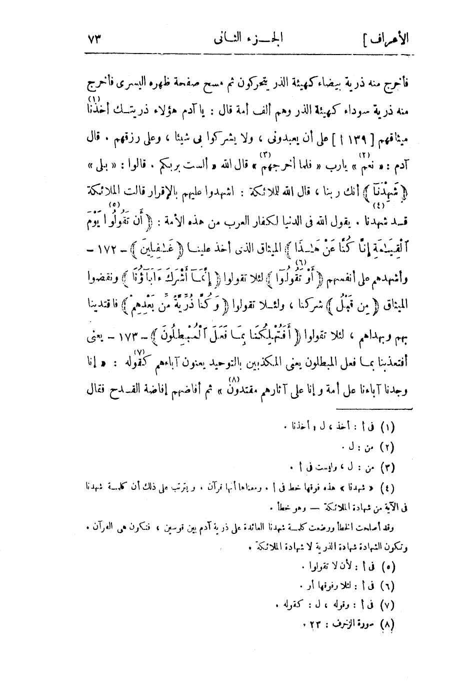 وقد أصلحت الخطأ ووضعت كلمة شهدنا العائدة على ذرية آدم بين قوسين، فتكون هي القرآن.