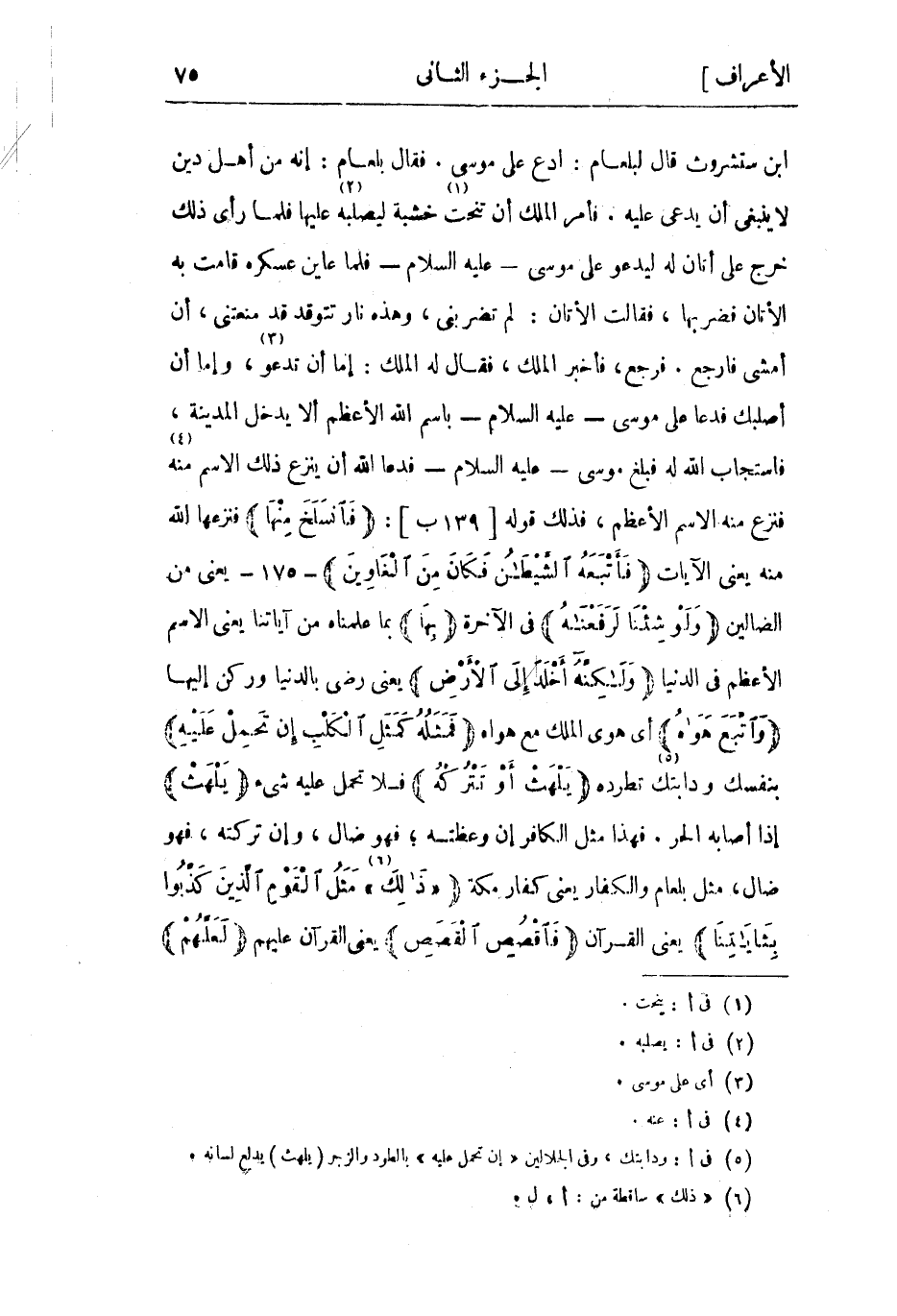 ابن ستشروث قَالَ لبلعام: ادع عَلَى مُوسَى. فَقَالَ بلعام: إنَّه من أَهْل دين لا ينبغي أن يدعَى عَلَيْه. فأمر الملك أن تنحت «1» خشبة ليصلبه «2» عَلَيْهَا فَلَمَّا رَأَى ذَلِكَ خرج على أنان لَهُ ليدعو عَلَى مُوسَى- عَلَيْه السَّلام- فَلَمَّا عاين عسكره قامت به الأتان فضربها، فقالت الأتان: لَم تضربني، وهذه نار تتوقد قَدْ منعتني، أن أمشي فارجع. فرجع، فأخبر الملك، فَقَالَ لَهُ الملك: إما أن تدعو «3» ، وإما أن أصلبك فدعا عَلَى مُوسَى- عَلَيْه السَّلام- باسم اللَّه الأعظم ألا يدخل المدينة، فاستجاب اللَّه لَهُ فبلغ مُوسَى- عَلَيْه السَّلام- فدعا اللَّه أن ينزع ذَلِكَ الاسم منه «4» فنزع منه الاسم الأعظم، فذلك قوله [139 ب] : فَانْسَلَخَ مِنْها فنزعها اللَّه منه يعني الآيات فَأَتْبَعَهُ الشَّيْطانُ فَكانَ مِنَ الْغاوِينَ- 175- يعنى من الضالين وَلَوْ شِئْنا لَرَفَعْناهُ فِي الآخرة بِها بما علمناه من آياتنا يعني الاسم الأعظم فِي الدُّنْيَا وَلكِنَّهُ أَخْلَدَ إِلَى الْأَرْضِ يعنى رضى بالدنيا وركن إليها وَاتَّبَعَ هَواهُ أَي هوى الملك مَعَ هواه فَمَثَلُهُ كَمَثَلِ الْكَلْبِ إِنْ تَحْمِلْ عَلَيْهِ بنفسك ودابتك «5» تطرده يَلْهَثْ أَوْ تَتْرُكْهُ فلا تحمل عَلَيْه شيء يَلْهَثْ إذا أصابه الحر. فهذا مثل الكافر إن وعظته، فهو ضال، وإن تركته، فهو ضال، مثل بلعام والكفار يعني كفار مكة «ذلِكَ» «6» مَثَلُ الْقَوْمِ الَّذِينَ كَذَّبُوا بِآياتِنا يعني القرآن فَاقْصُصِ الْقَصَصَ يعني القرآن عليهم لَعَلَّهُمْ